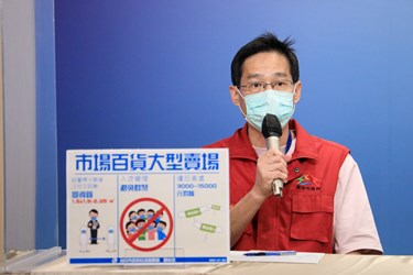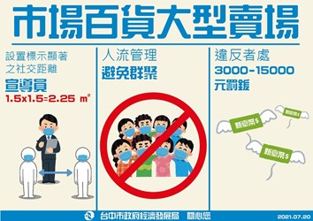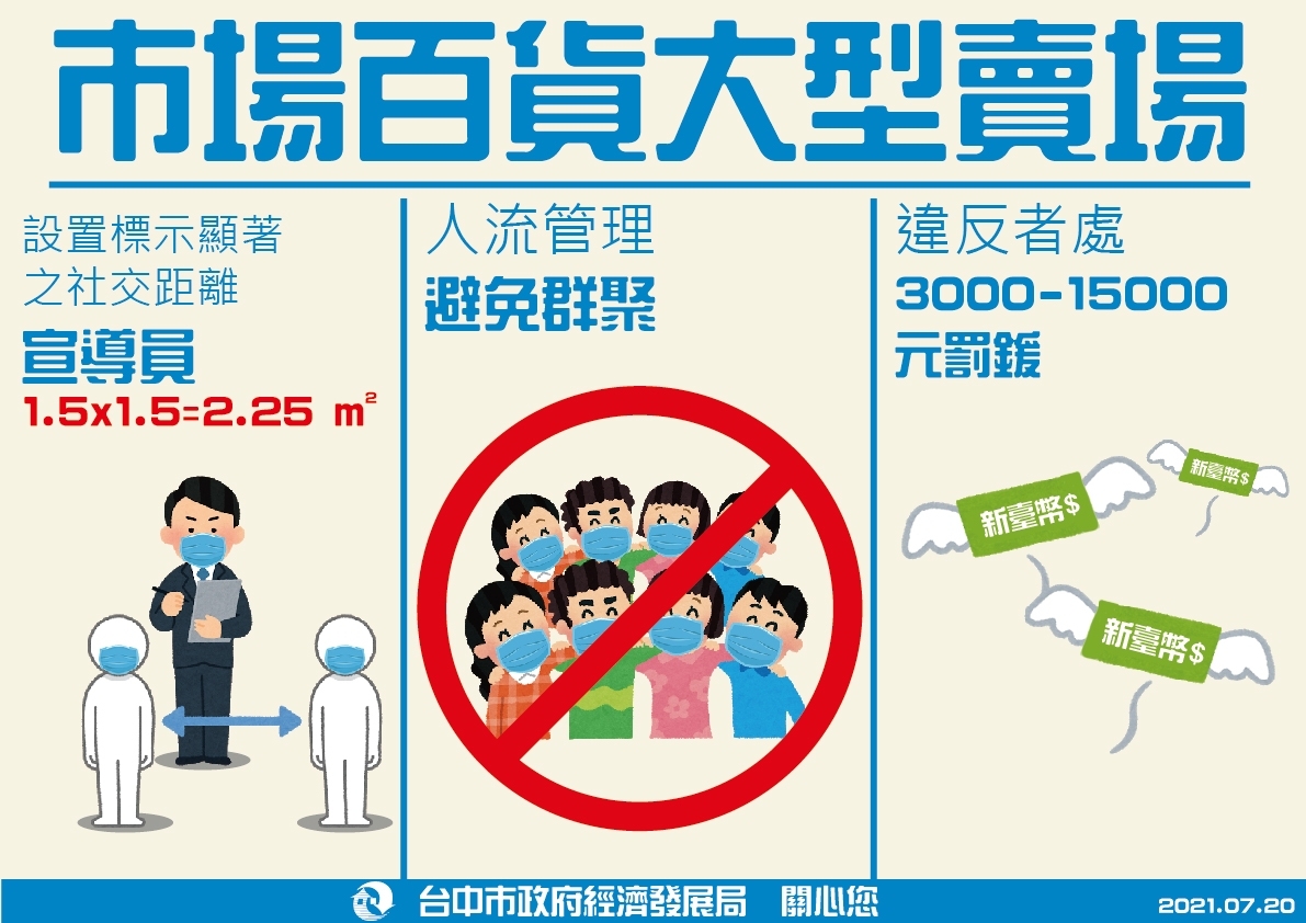 經濟發展局長張峯源表示,為避免百貨、大型賣場、市場等民生消費場域,人員面對面服務且空間開放、人流量較多易發生社區傳播風險,市府今日公告擴大要求上述場域業者設置社交距離宣導員,該人員除隨時於人潮聚集、排隊熱點宣導民眾注意社交距離,並做好容留人數控管,業者如違反防疫規定,將視情節輕重,依《傳染病防治法》處3,000元至15,000元罰鍰。