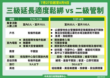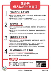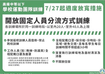另外,國民運動中心、港區運動公園(不包括所轄游泳池及跳水池)配合防疫規定及防疫管理指引得開放使用;公立戶外運動場域方面,若現場有專人管理,可落實並管控實聯(名)制者,得開放使用;步道、操場或田徑場等屬走動式不接觸設施亦開放使用,但附設兒童遊具或體健設施等因難以保持社交安全距離、即時消毒及落實實聯(名)制,仍暫停開放。