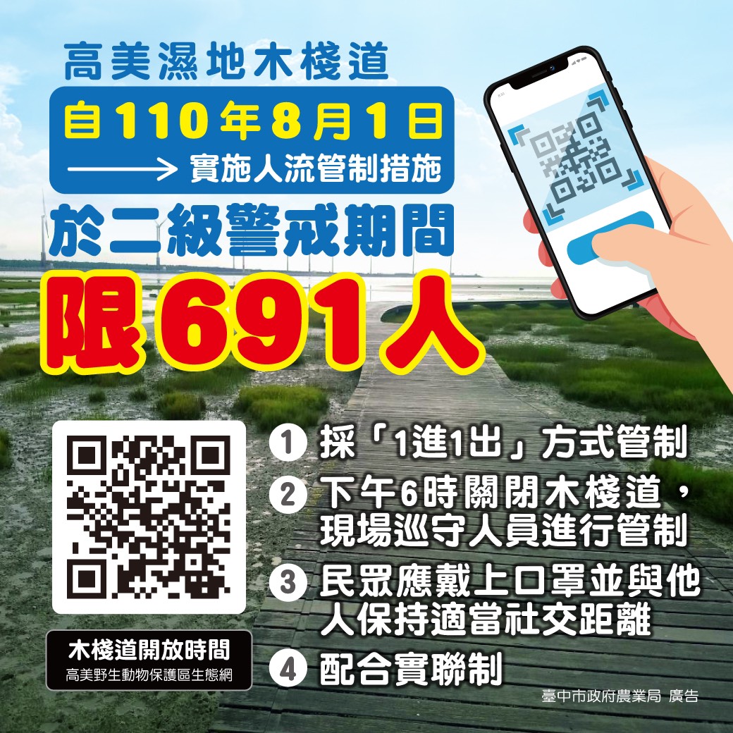 高美濕地木棧道年度維護工程順利完成,將自8月1日起重新開放民眾進入,並持續落實防疫實施人流管制,人數以691人為限,採1進1出方式控管;且為維護民眾安全,每日18時關閉木棧道,並視每日潮汐情況調整時間,呼籲遊客到訪前可先上網查詢開放時段,到訪後也須遵守野生動物保護區與防疫相關規定,避免受罰。