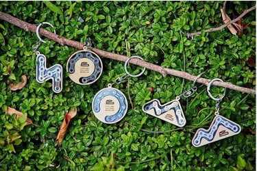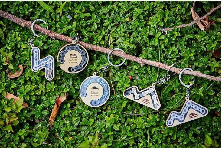 此外,「自行車文化探索館」的「單車夥伴計畫」文創商品,保留自行車零件特色,化為創意生活小物。其中,鏈條鑰匙圈展現自行車鏈條節點可彎折、自由排列圖案特性,輻條書籤則運用零件可彎可折、具一定硬度的特性,簡單加工捨棄複雜程序,展現自行車輻條特性。