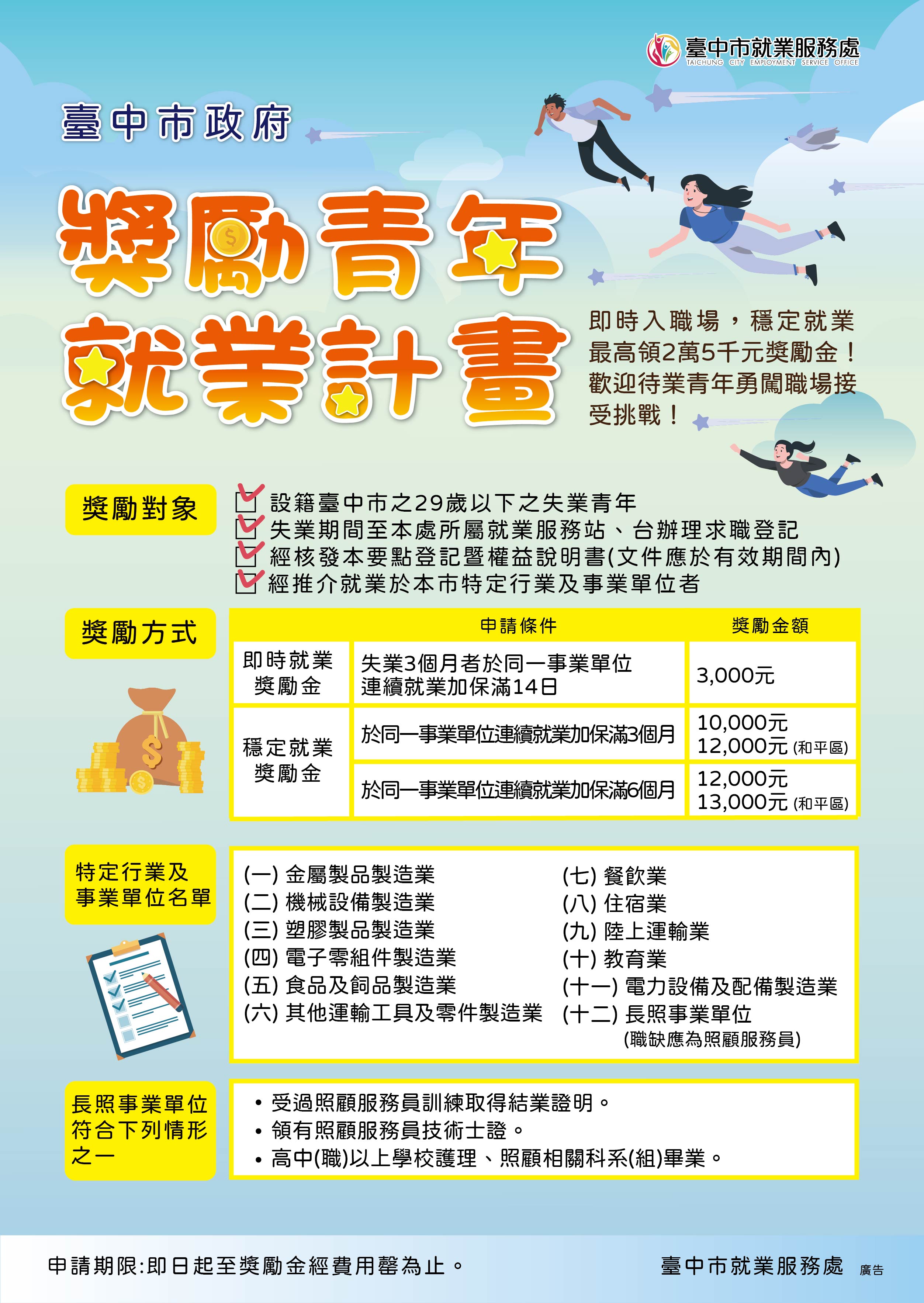 勞工局說明,除就業獎勵金外,台中市就業服務處針對青年就學、求職各階段提供各項就業服務措施,如職業適性診斷、履歷健診、面試技巧指導及職場體驗等措施,透過主動出擊與台中市各大專院校合作,協助青年找出自己的適性方向並規劃職涯藍圖。