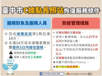 此外,台中市C據點長照站自8月6日起,也陸續輔導全市103家據點有條件恢復服務。除參加據點活動的長輩及工作人員須依規完成第一劑疫苗接種且滿14日或自費篩檢外,對於活動空間規劃,使用人數應降載,以每人2.25平方公尺計算容留人數,且暫不提供喘息服務,餐飲不開放內用,改採餐盒外帶或外送服務。