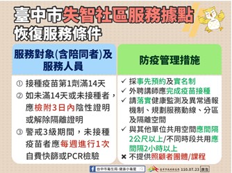 考量失智服務對象及家庭照顧者需求,台中市依據衛生福利部於今年7月22日訂定「失智社區服務據點因應COVID-19防疫管理指引」有條件恢復服務,凡參加據點活動的長輩及工作人員都應接種疫苗第一劑且滿14日,未接種疫苗或接種第一劑疫苗未滿14日者,首次提供或接受服務前,須自費提供3日內快篩或PCR陰性證明,以維護長輩及工作人員健康;餐飲服務則採分批用餐,以梅花座或使用隔板保持社交距離。