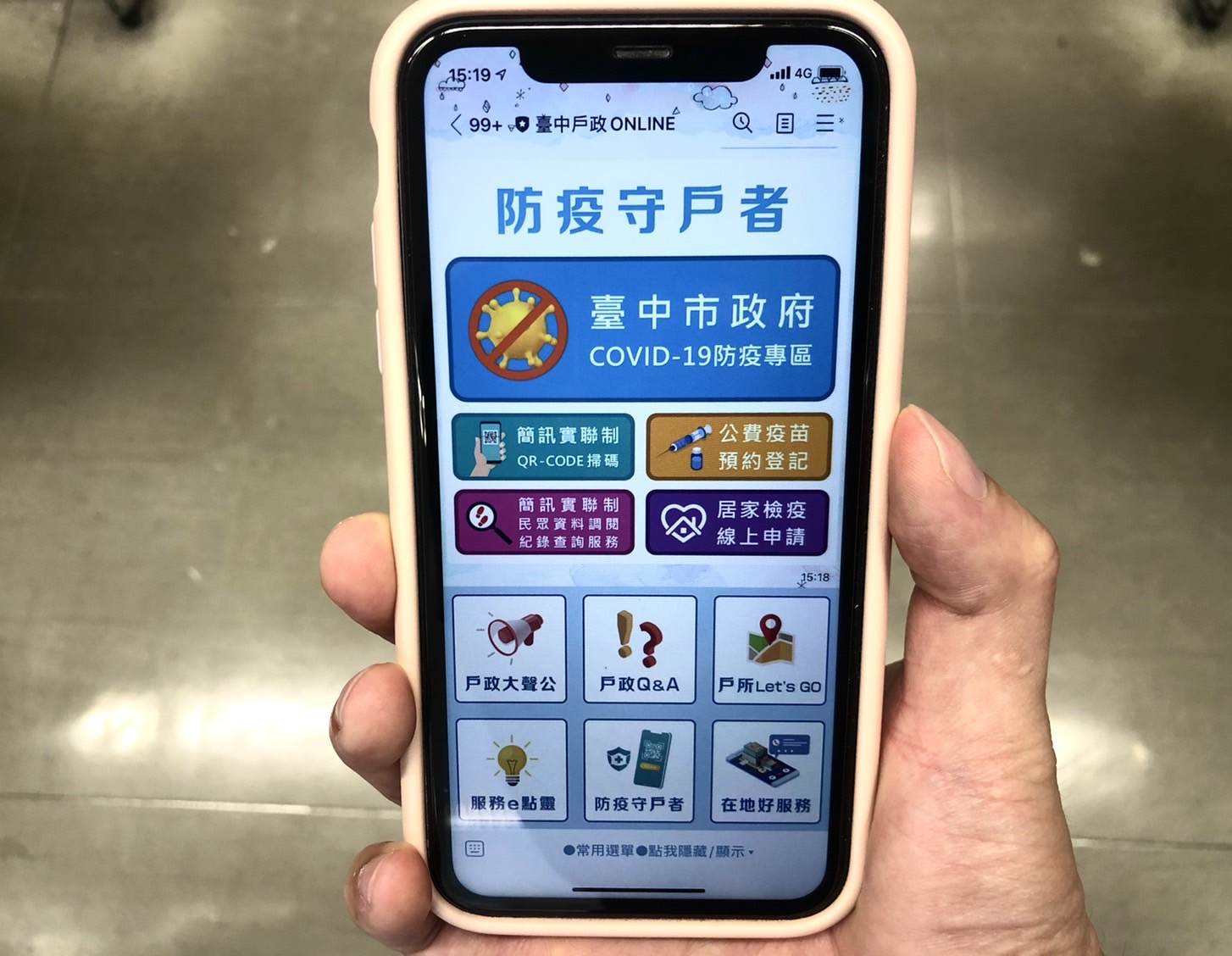 民政局表示,台中市民政服務系統防疫最即時,台中戶政ONLINE「防疫守戶者」功能,再次改版增加連結衛福部「簡訊實聯制/民眾資料調閱紀錄」功能,提供民眾查詢疫調資料下載存取情況,民眾只要輸入手機號碼及圖形驗證碼,取得簡訊驗證碼並填寫完成後,即可顯示近28天內是否有疫調人員調閱過輸入該手機號碼的簡訊實聯制資料。