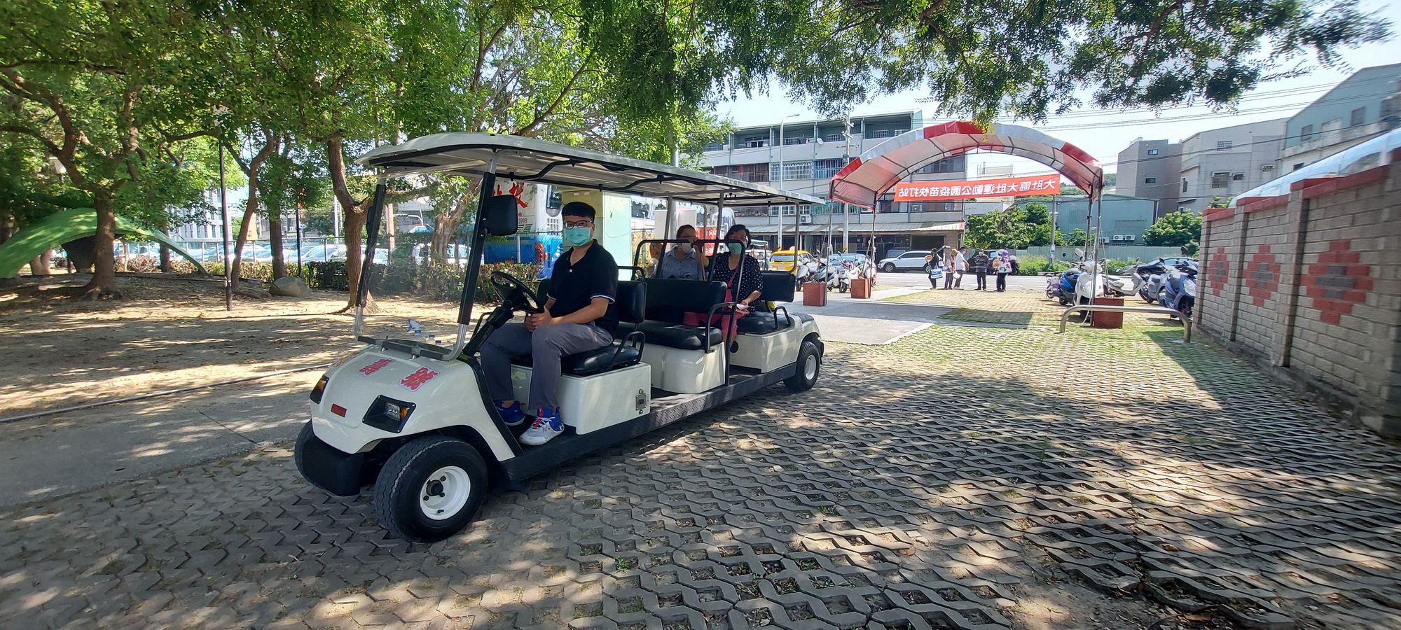 大肚區長白峨嵋指出,配合快打站撤離校園,大肚區快打站調整至大肚運動公園太極拳訓練場為民眾提供接種服務,由於快打站場所距離園區路口約200公尺,為減輕行動不便長者行動負擔,調用2部電動高爾夫球車接駁民眾至快打站,民眾搭乘高爾夫球車漫遊綠意盎然的公園內,間接舒緩民眾接種疫苗的緊張情緒,民眾紛紛感謝市府及公所的貼心,直呼打疫苗還能體驗「微旅遊」的渡假氛圍,相當有趣。