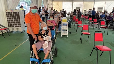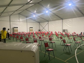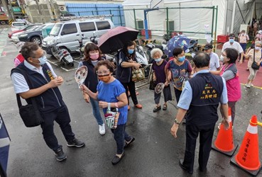 吳局長今日前往龍井「快打站2.0」視察,關心現場長者接種狀況。他表示,龍井區快打站2.0設置於公所對面籃球場,原先搭設鋁合金棚架,並設置20台水冷扇,由於昨日天氣高溫炎熱,仍無法有效降溫阻隔熱氣進入。公所於昨日接種場次結束後,積極調整優化,於鋁合金棚架周圍增設遮陽帆布隔絕熱氣,同時再布設410噸冷氣機降低接種環境溫度,讓快打站整體環境舒適。