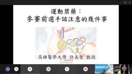 運動局說明,此次研習邀請高雄醫學大學運動醫學系教授兼中華奧林匹克委員會運動禁藥管制委員許美智,以及中國醫藥大學附設醫院感染管制中心副院長兼衛生福利部傳染病防治醫療網中區指揮官黃高彬擔任講師。許委員傳授她多年在運動醫學及運動禁藥領域的經驗,包括不要使用禁藥、不要誤服運動禁藥、了解治療用途、學習運動禁藥查詢系統並分享國內外案例,指導運動員們勇闖體壇,從飲食與就醫習慣做好個人管理。