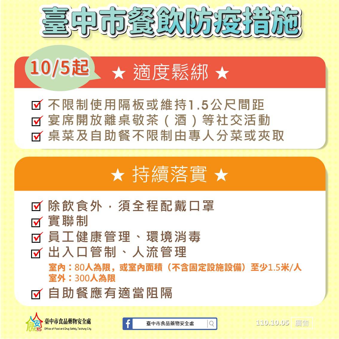 衛生局說明,考量台中市疫情已趨緩並且穩定控制,台中市餐飲場所內用,不再限制使用隔板或維持1.5公尺間距,並放寬桌菜及自助餐取菜方式,不限制由專人分菜或夾取。自助餐需有適當覆蓋,建議使用一次性拋棄手套夾菜,或每次使用後清消菜夾,以避免接觸性感染。