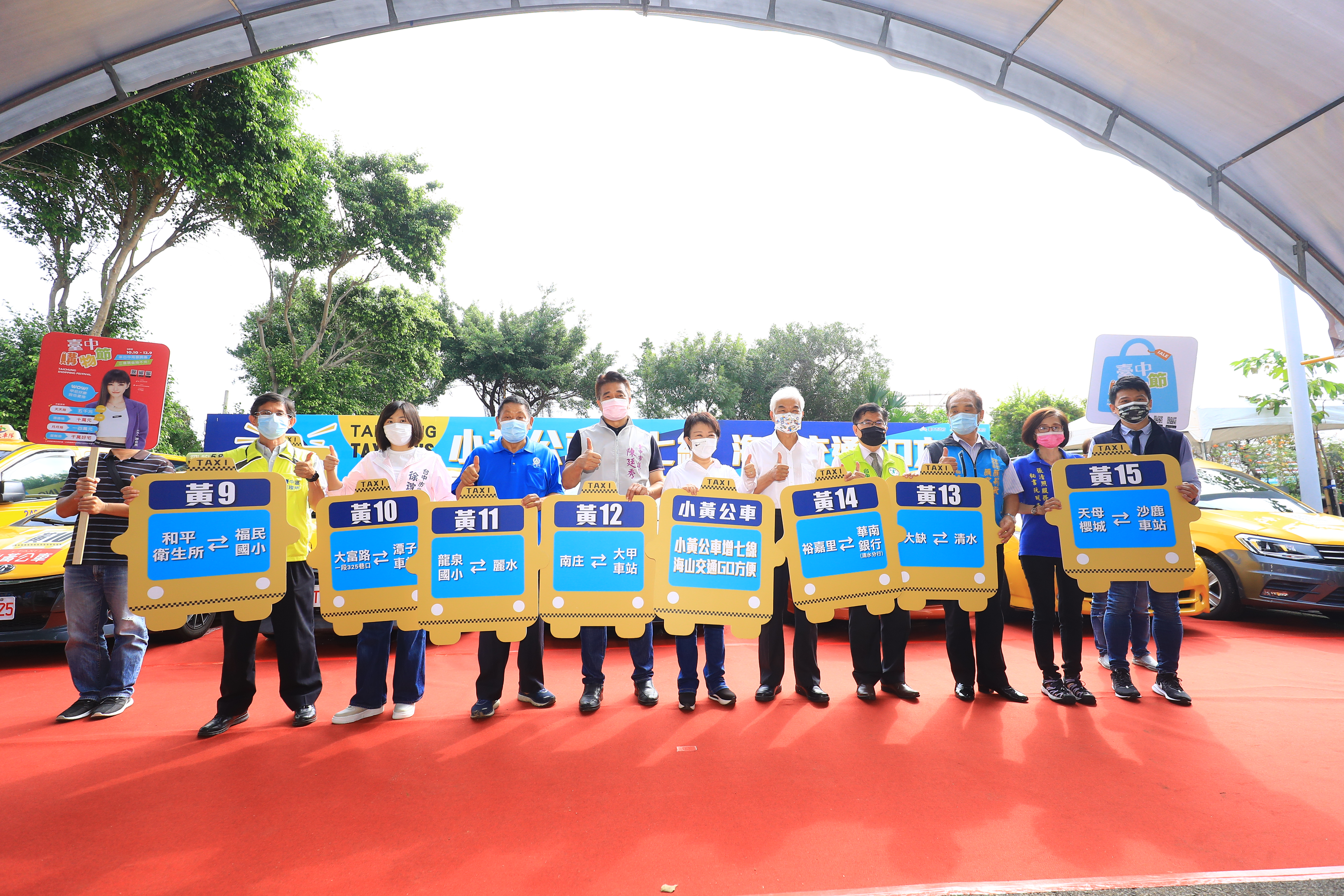 交通局長葉昭甫說明,去年台中市小黃公車共有8條路線,包括黃1路豐原球場線、黃2路東勢埤頭里線、黃3路新社新五村線、黃4路豐原朴子線、黃5路黃竹線、黃6路桐林線、黃7路舊正象鼻線、黃8路喀哩線,行駛於豐原、東勢、太平與霧峰地區。今年新增7條小黃公車路線,包括黃9路新社白毛台線、黃10路潭子大富線、黃11路麗水龍津線、黃12路大甲大安線、黃13路客庄菁埔線、黃14路清水塭仔寮線、黃15路沙鹿水裡社線,將小黃公車推進至海線地區,並進一步加強新社、和平、潭子與神岡公共運輸,自720日起以預約方式提供服務,並提供民眾免費搭乘。
