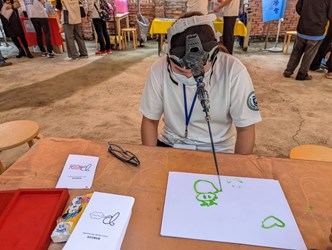 今日成果展,在台灣畫話協會陳道明先生和復興國小木箱鼓隊的音樂及鼓聲中拉開序幕,此次成果展包含靜態展覽和互動體驗區。因為一些身障朋友難以控制肌肉張力,需要透過臉靠著手或雙手互握,控制手部動作作畫;畫話協會以多元藝術療育服務身障朋友,設計名為「頭杖」的輔具,讓肌萎或重度腦性麻痺朋友戴在頭上作畫。此外,也邀請民眾體驗用頭作畫,觀看歪斜擺設的畫作,體會身障朋友控制扭曲歪斜的身體創作的過程,感受其珍貴與撼動人心之處。