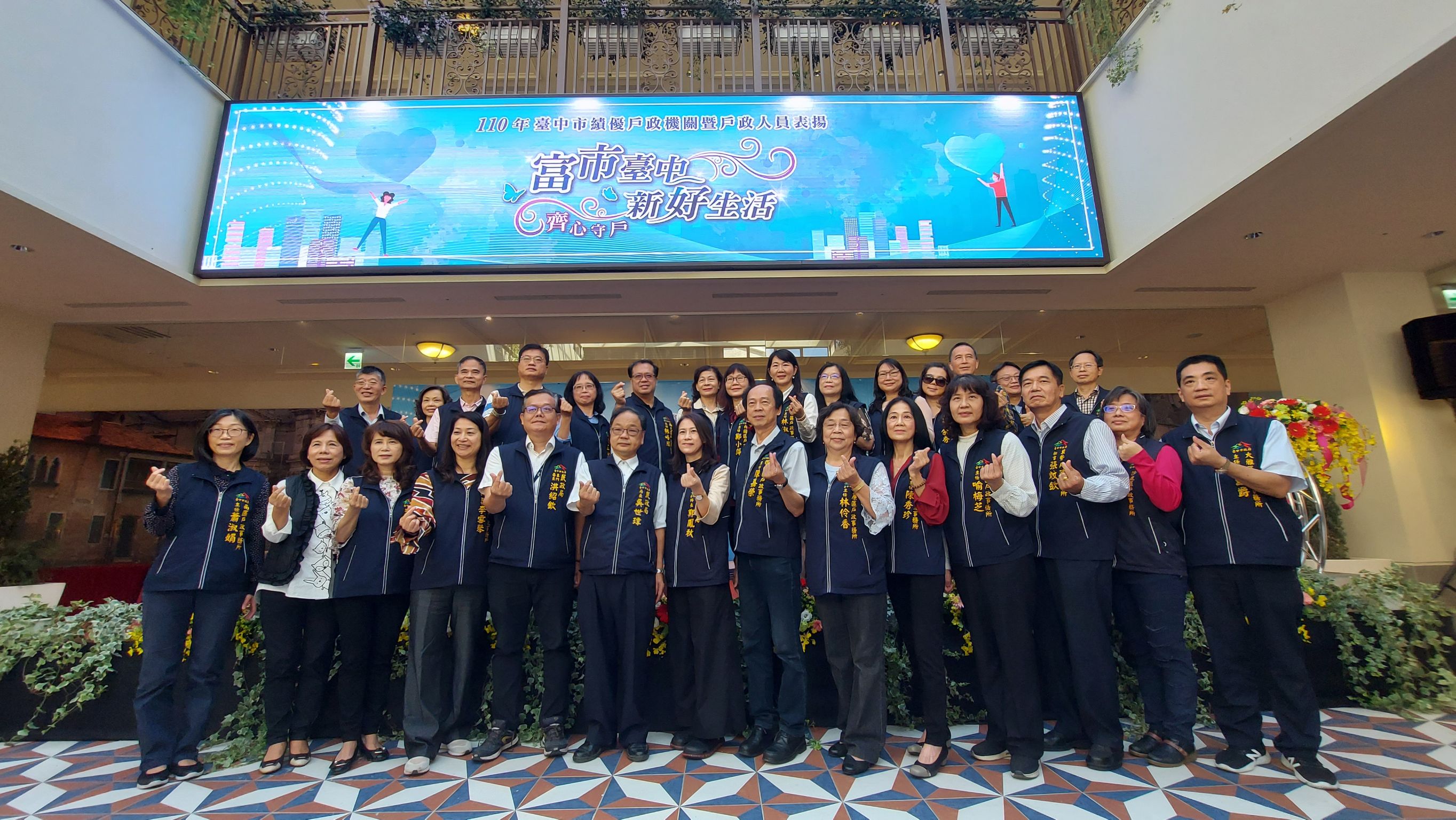肯定戶政人員優異表現,台中市政府民政局今(19)日在麗寶Outlet Mall舉辦績優戶政機關暨人員表揚活動,除轉頒內政部「110年度績優戶政機關楷模」、「內政部績優戶政人員」,以及長年配合內政部戶役政主機維護作業機關,同時頒發台中市「績優戶政業務評鑑特優機關」及「績優戶政人員」等,共12個機關、35位人員獲獎。