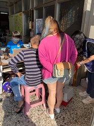 梧棲區頂寮里活動中心外帶著狗貓排隊報到的民眾
