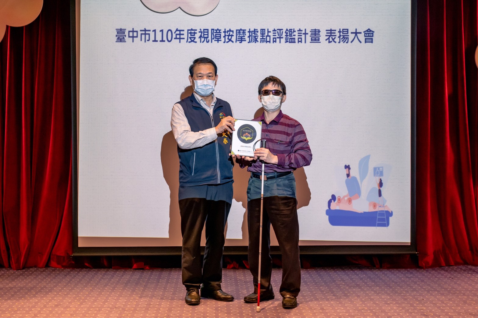 勞工局長張大春親自頒發臺中市優良視障按摩獎牌