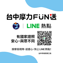 勞工局說明,相關資訊可於網路搜尋「台中市視障按摩」(https://msg.taichung.gov.tw/)或於LINE熱點平台( https://spot.line.me/)搜尋「#台中優良視障按摩」( https://lin.ee/RmcunVw),歡迎大家多多利用。