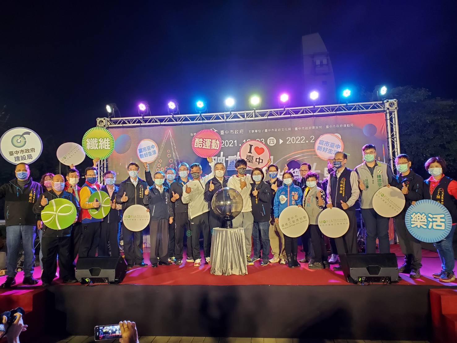 今天點燈活動,副市長黃國榮、文化局長陳佳君、運動局長李昱叡、都發局副局長紀英村、觀旅局主任秘書林鴻文、台中市新建工程處副處長廖文偉及建設局專門委員徐守全、市議員李天生、大里區長鄭正忠、副區長張鎮昌、主秘張慶庸、東區區長何宜真、工策會副總幹事林銀穀、台中市奧運國手王星皓、東山高中游泳隊教練王耀偉均到場,立法委員何欣純助理黃錦梅、市議員林碧秀主任周海威、市議員林德宇主任陳弈安、市議員張滄沂主任曾朝佐、蘇柏興助理趙桂芬及大里區多位里鄰長也共襄盛舉。