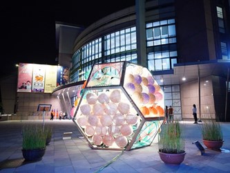 文化局說明,另一光照裝置藝術《永恆》則座落於纖維工藝博物館前廣場,利用「纖維」為主要材質,在大型六角球體的不同切面,巧妙安置編、結、織、染、繡的工序技法,呼應纖維工藝博物館的主題性,象徵纖維工藝在人類歷史中所佔據的永恆價值。