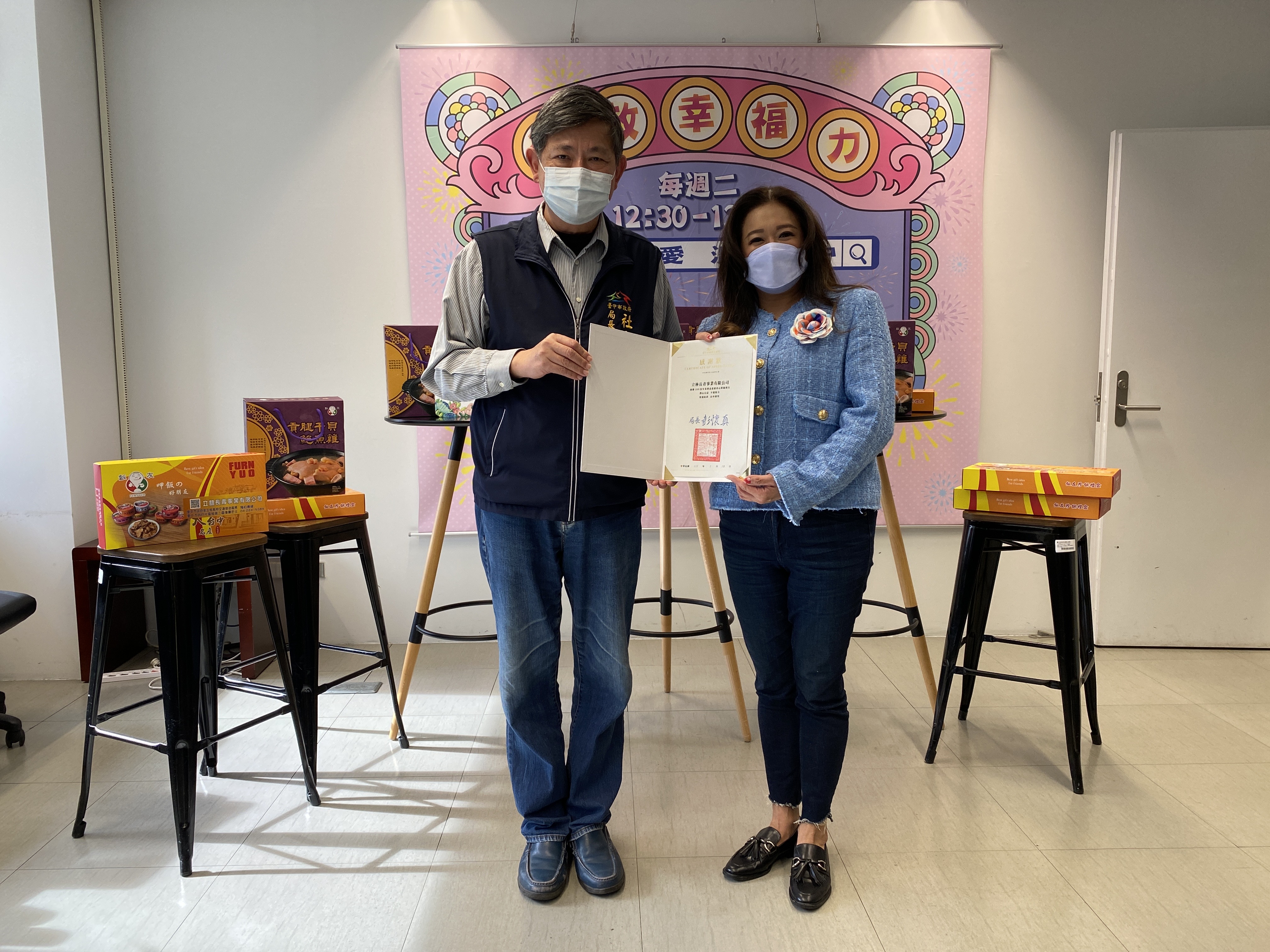 彭局長特別感謝立林長期以來支持與協助市府,捐贈快篩劑、消毒用品等防疫物資和溫馨年菜,做公益從不落人後;也感謝華慈今年加入公益行列,加碼支持,有這些好夥伴的支援,讓台中更溫暖、更有愛。