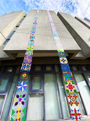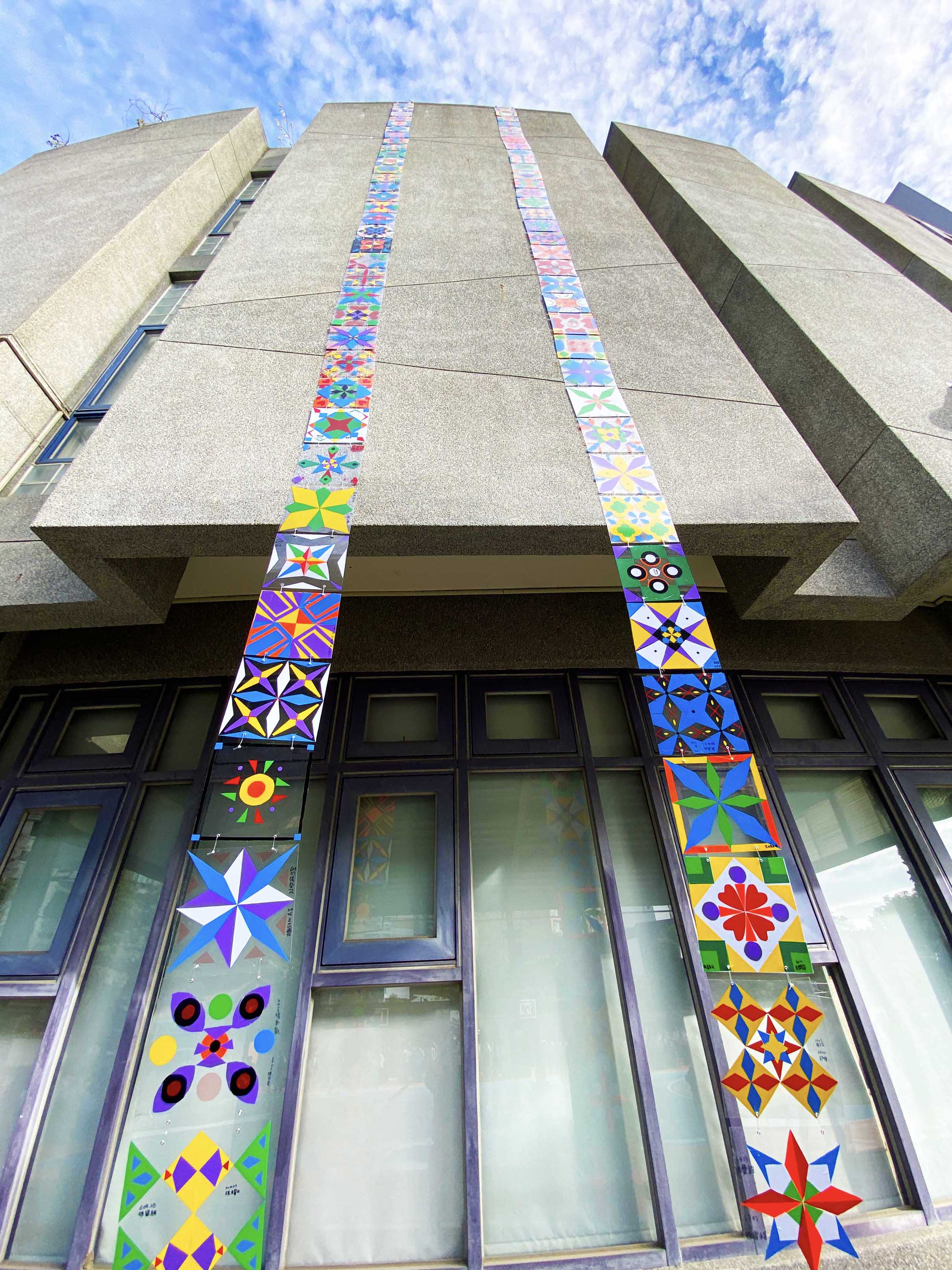 此外,大墩國小老師也帶領學生觀察半戶外球場鋼構之美,再進一步討論如何以四方連續窗花為發想起點,延伸創作出獨特的卡典西德拼貼作品,並組合成大型裝置後懸掛於校舍大樓外牆,為校園增添美感氛圍,獲得家長及社區民眾良好的反饋。負責承辦的張堯統老師說,希望藉由觀察、體會和創造,讓每個學生都能是小小藝術家!
