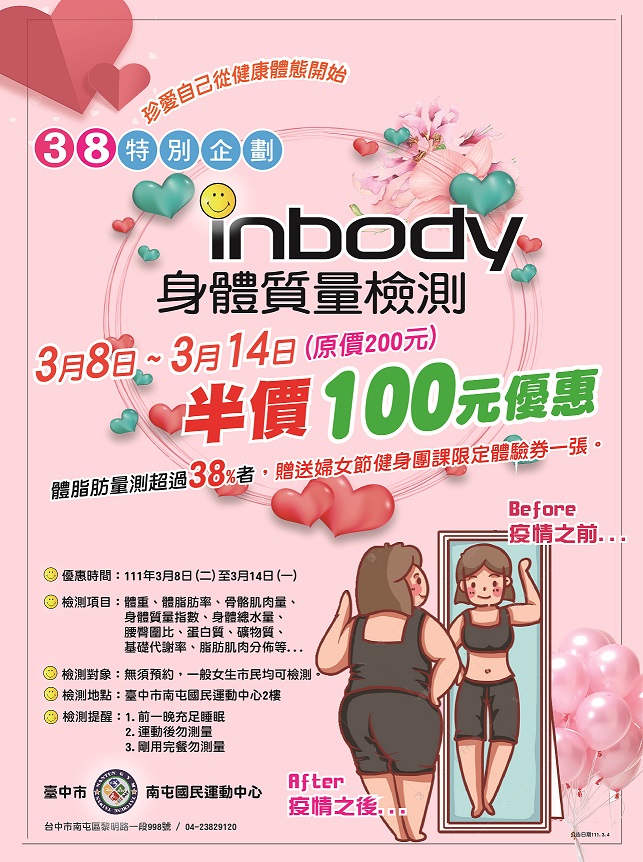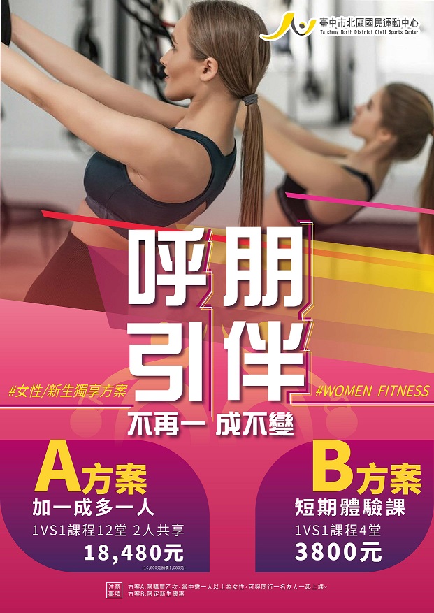 運動局說明,因應國內疫情各國運中心持續落實防作為,並針對女性族群提供優惠參加專案,如朝馬國民運動中心開設小班制游泳女性專班、北區國民運動中心祭出體適能一對一課程、南屯國民運動中心推出「女力崛起─三八女神節特別企劃」提供優惠方案、大里國民暨兒童運動中心規劃婦女節限定活動,另包含潭子、長春、港區運動公園等均推出多項課程與優惠。
