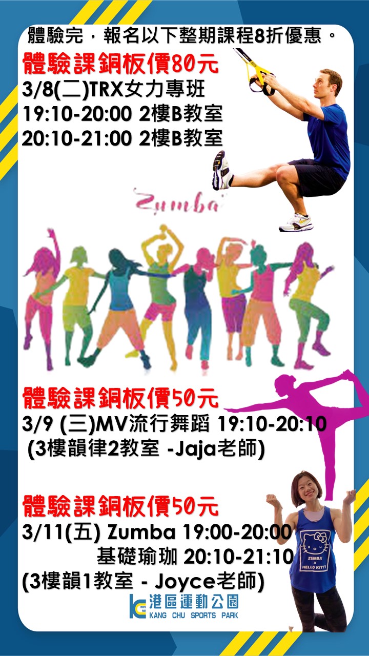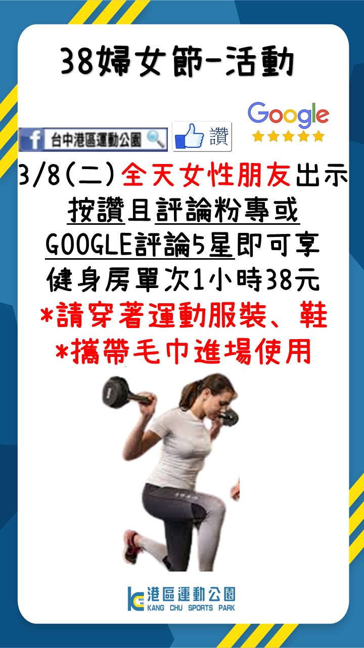 相關活動資訊可至各運動中心臉書粉絲專頁查詢,朝馬國民運動中心( https://zh-tw.facebook.com/chaomasports/ )、北區國民運動中心( https://www.facebook.com/TNDCSC/ )、南屯國民運動中心( https://zh-tw.facebook.com/nantun.sc )、長春國民暨兒童運動中心( https://www.facebook.com/CCCSCWDYG/ )、大里國民暨兒童運動中心( https://www.facebook.com/DLCSCWDYG/ )、潭子國民暨兒童運動中心( https://www.facebook.com/TZCSC/ )、港區運動公園( https://www.facebook.com/kangchusportspark/ ),歡迎踴躍報名參加。(3/8*10)*運動局