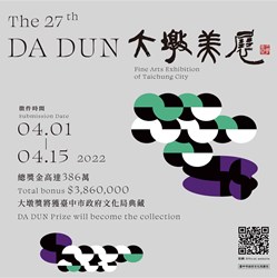 「台中市第27屆大墩美展」徵件日期自4月1日至4月15日止,歡迎藝術創作者至大墩美展官網( https://reurl.cc/OpeMDD )下載簡章電子檔,或至台中市政府文化局、大墩文化中心、葫蘆墩文化中心、港區藝術中心或屯區藝文中心服務台索取紙本簡章,如有相關問題可電話洽詢04-22289111分機25217黃小姐。