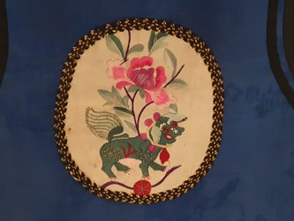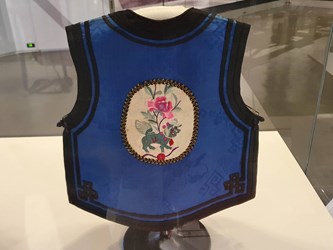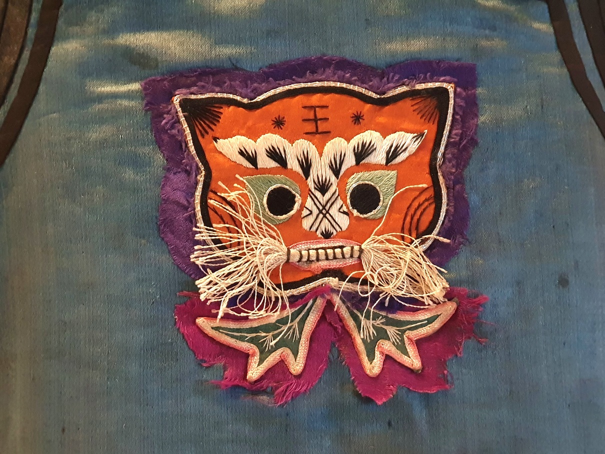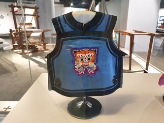 這件「男童虎紋背心」原是刺繡文物鑑定專家粘碧華老師所收藏,粘老師說,織品紋樣及布料常能顯示不同年代的文化特色,經研究考證,這件背心應為清朝咸豐、同治時期作品,至今已超過160年,纖博館成立後納入館藏,由於保存狀況極佳,更具學術研究價值。