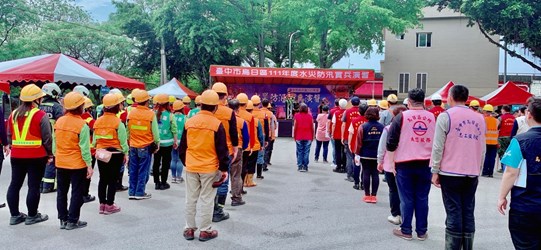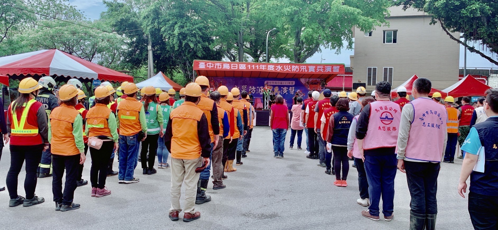 梅雨、颱風季將來臨,因應防汛準備,台中市政府水利局與烏日區公所今(25)日上午於烏日區湖日里朝天宮前廣場,辦理「台中市烏日區111年度水災防汛實兵演習」,市長盧秀燕指派副秘書長陳如昌擔任統裁官、區長林崇懿擔任指揮官,假想強烈颱風帶來強大豪雨,溪水暴漲,伴隨地震發生,如何疏散及搶救受困民眾,以強化區級災害應變中心及跨機關聯合防救災應變能力。
