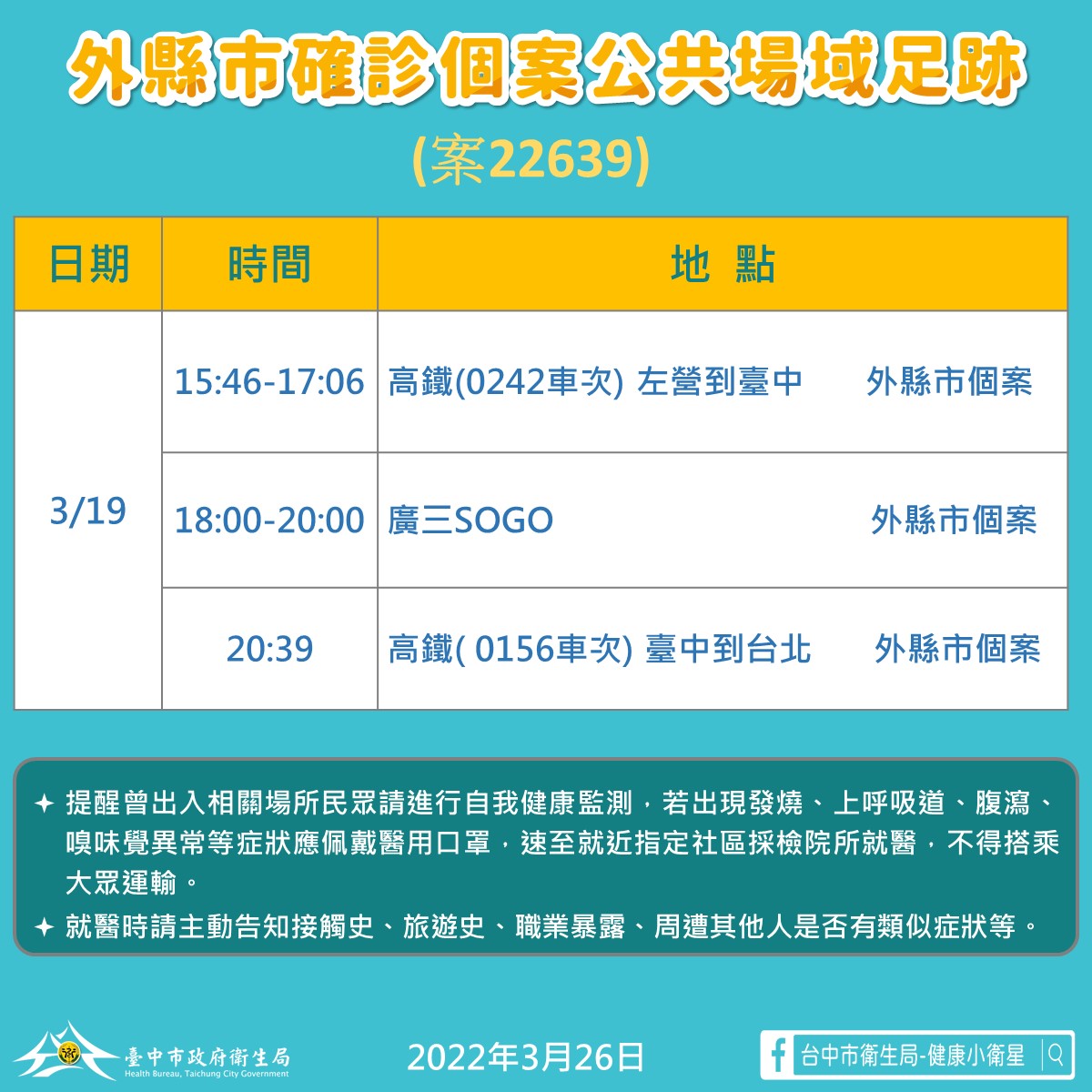台中市政府衛生局今(26)日接獲外縣市通知本土確診個案22639,為本國籍20多歲男性,3月25日因症狀就醫後確診,CT值17.2,3月19日有台中市活動足跡,可傳染期間無台中市接觸者,相關足跡已通知全面清消及工作人員加強健康監測。