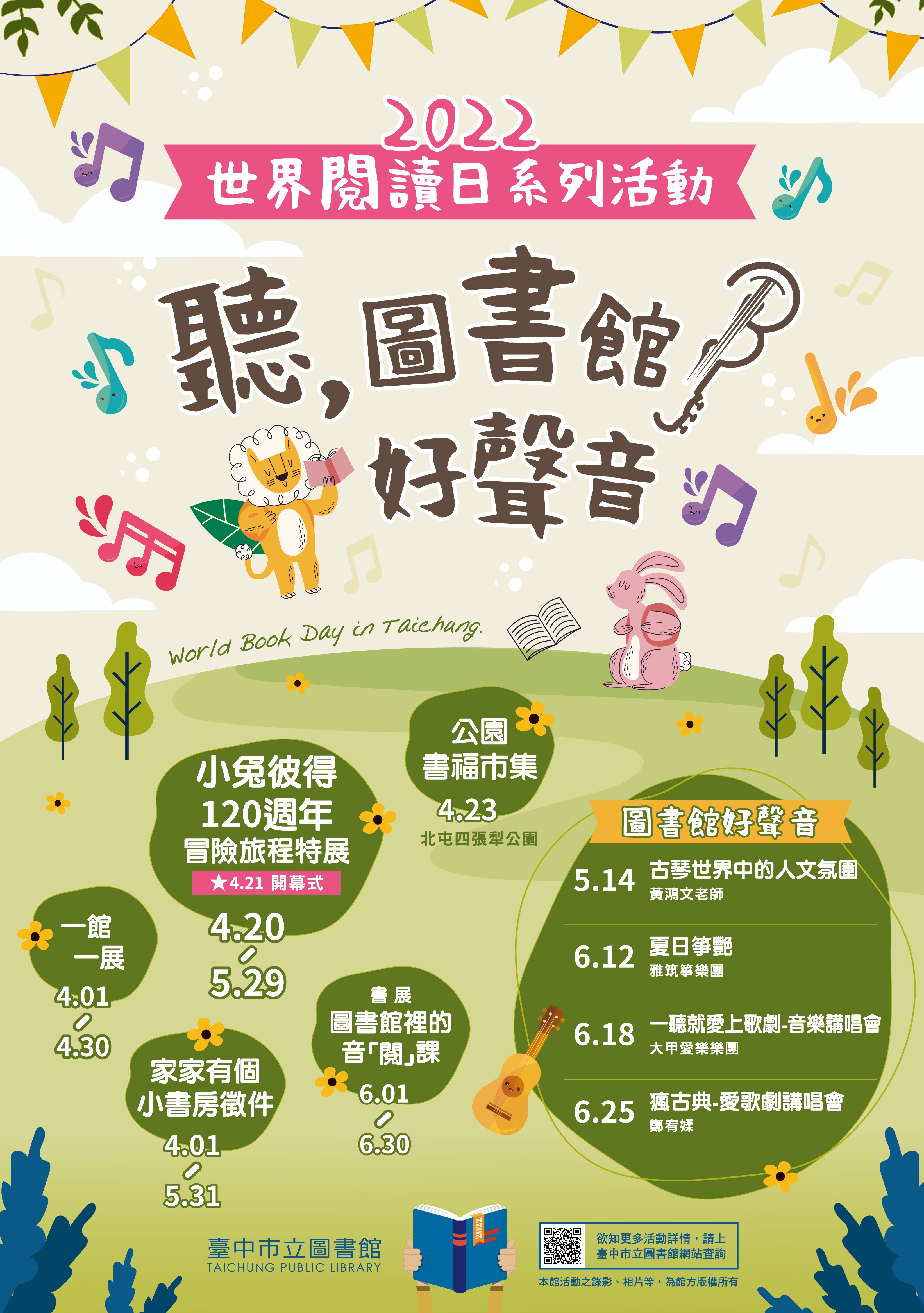 今年台中423世界閱讀日特別不一樣!台中市立圖書館將於4至6月期間,舉辦《聽!圖書館好聲音》活動,共推出六大主題活動,讓民眾沉浸於閱讀和音樂的海洋,享受歌劇與講唱會的盛宴,更與出版社合作推出「小兔彼得120週年冒險旅程」特展,讓書迷們親身感受英國經典作家暨插畫家海倫·雅翠絲·波特(Helen Beatrix Potter)打造的可愛童話世界!