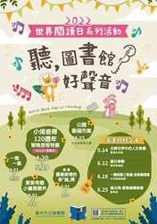 台中市立圖書館長張曉玲指出,《聽!圖書館好聲音》4月起將串聯所有館別跨單位合作,推出一系列長達3個月的活動,包括一館一展、家家有個小書房徵件、「小兔彼得120週年冒險旅程」特展、圖書館裡的音「閱」課、圖書館好聲音等活動,還加碼舉辦公園書福市集,中市圖歡迎民眾踴躍參與,一起在好書陪伴下,展開精采有趣的冒險旅程!