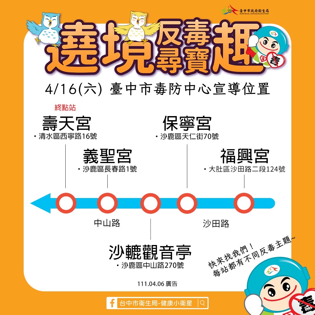 國內宗教大事大甲媽祖遶境將於後(8)天起駕,每年吸引百萬信徒參加,一起瘋媽祖,台中市政府衛生局後天於大甲鎮瀾宮周邊,4月16和17日於大肚區、沙鹿區及清水區沿途地點,設置「遶境反毒尋寶趣」,結合在地文化拉近民眾距離,提醒多一分警覺,少一分危險,拒絕毒品進入家園。