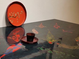 策展人楊美玲說明,此次展出70件賴作明代表作,包含樹漆畫、樹漆陶、繩胎漆器、脫胎漆器及木胎漆器等5大類型。其中於2009年完成的「木胎漆器」經典作品〈清清桌子〉長2米、寬1米,描繪20餘條色彩鮮豔的手繪錦鯉,悠游於波光粼粼的綠川,水面深淺不一的綠色光澤,充分表現出賴作明擅長的變塗技法。