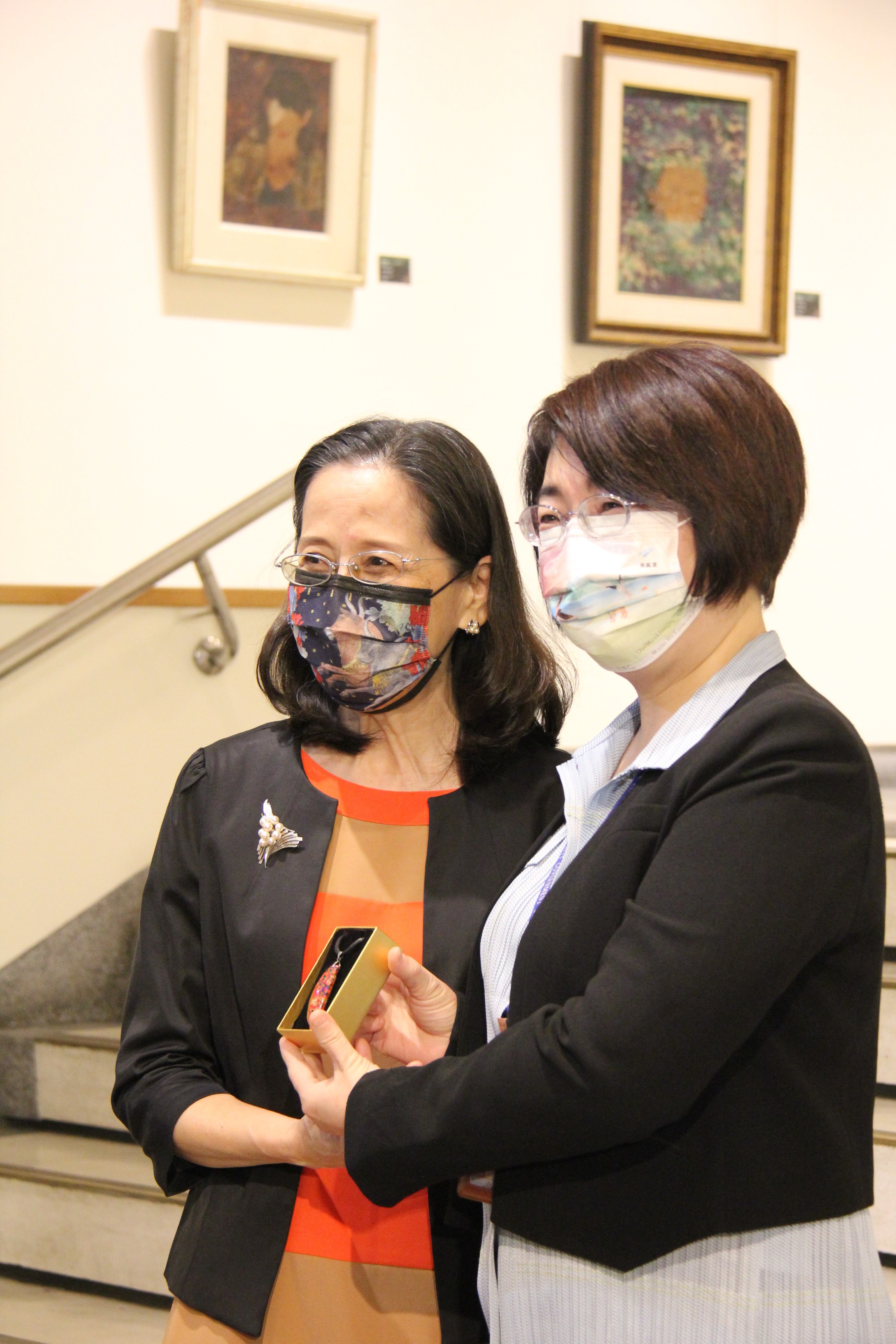 賴作明遺孀尤淑貞表示,將名為〈台灣亮起來〉的漆藝項鍊致贈陳局長,漆樹的葉子形狀極似台灣的形狀,〈台灣亮起來〉項鍊係以漆藝不斷的研磨推光,正如漆藝擦亮台灣,也是賴作明的一生懸命,非常感謝市府長期對漆藝文化的推廣與重視,讓代表台中之光的漆藝精神使台灣亮起來。