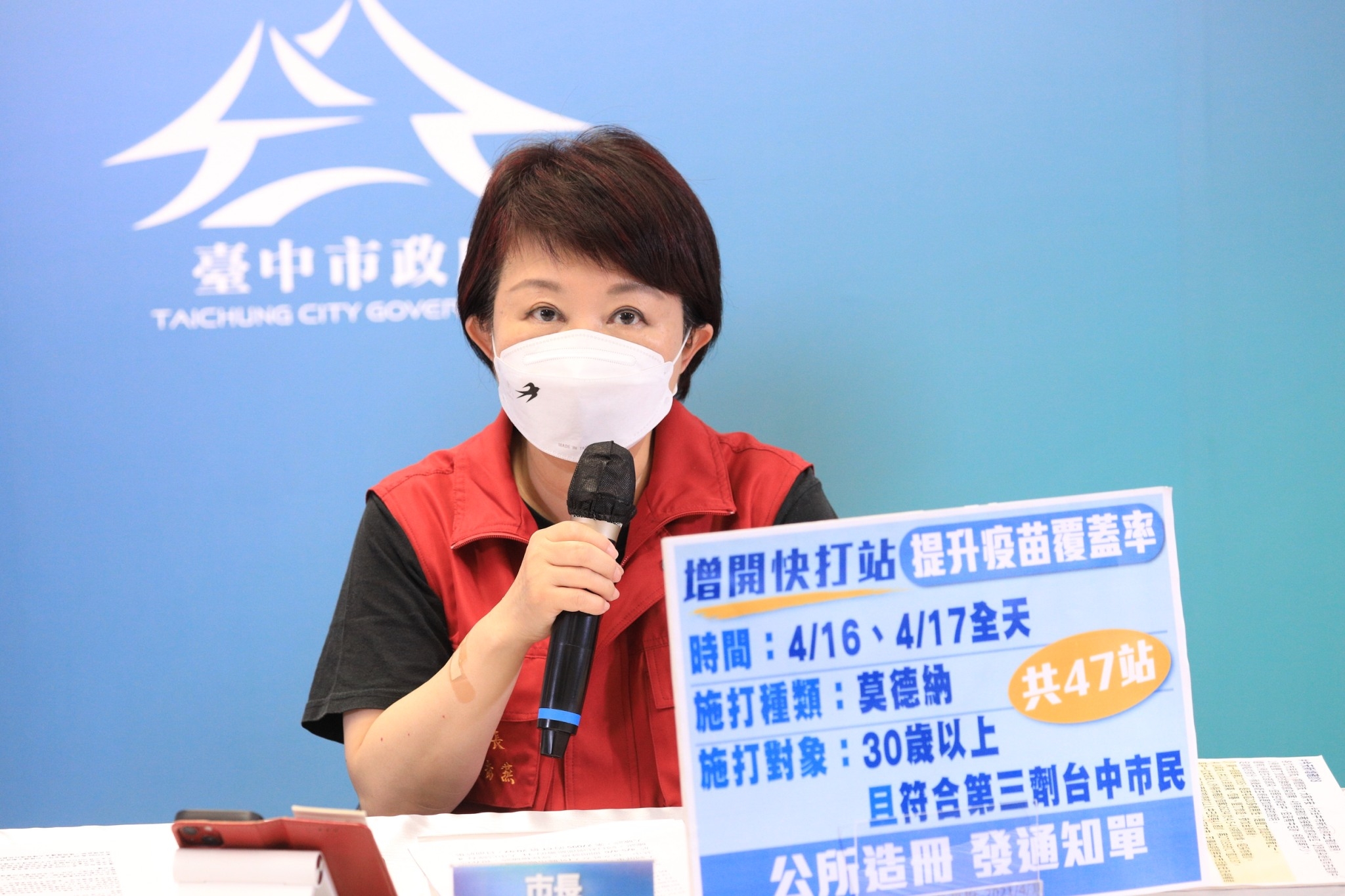 國內本土疫情持續升溫,確診數連日破百例,為提升城市防護力及個人保護力,市長盧秀燕今(10)日表示,台中市政府首次下修年齡,開放設籍台中市30歲以上符合施打第三劑市民,共約33萬名,可於4月16、17日兩日至全市47處快打站施打莫德納疫苗,市府將統一造冊、分流施打,各區公所將主動通知,民眾免預約、免排隊,請市民按通知時間、地點到快打站施打。