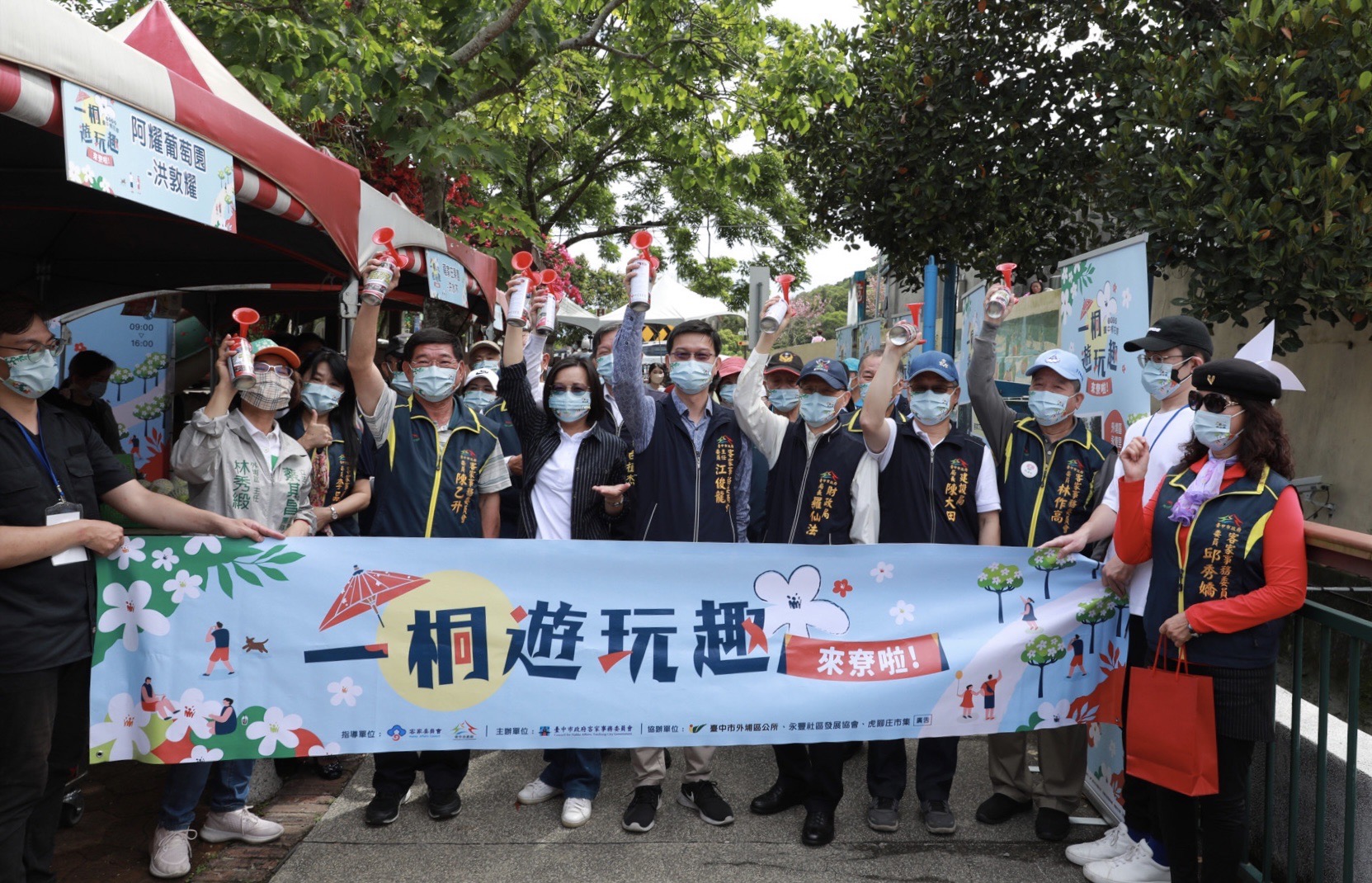客委會表示,今日活動配合防疫政策,參與輕旅行民眾皆需提供接種3劑疫苗證明;現場人員並手持防疫宣導牌走動式宣傳「全程戴好口罩,保持安全社交距離」。活動由市府客委會主委江俊龍主持,中央客家委員會處長廖美玲、市府財政局長羅仙法、建設局長陳大田、市議員張瀞分、外埔區公所主任秘書白植杰及立法院副院長蔡其昌服務處主任林秀緞等人,皆到場與遊客一起欣賞美麗的四月雪。(4/23*13)*客家事務委員會