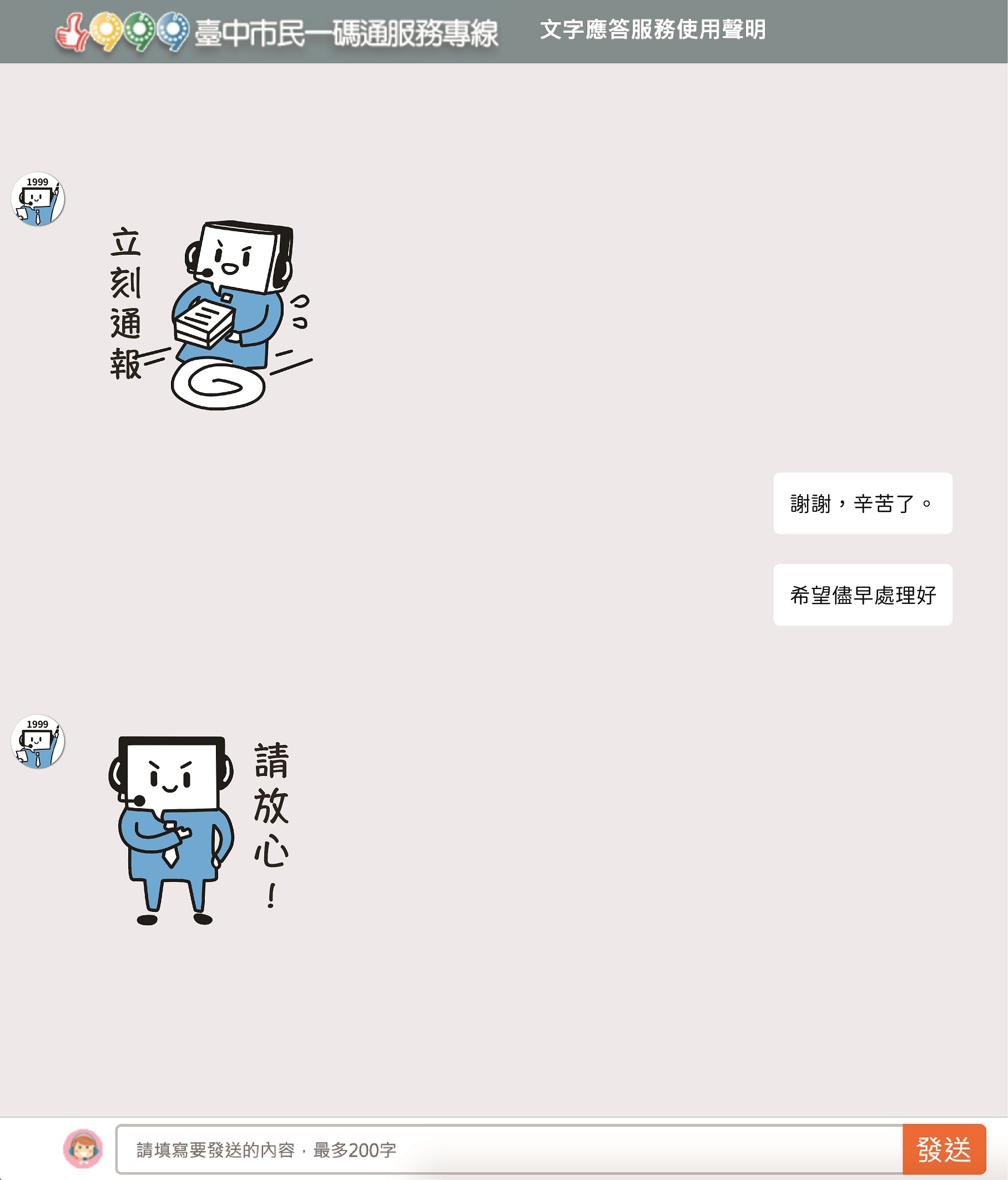 研考會主委吳皇昇說明,民眾針對市政問題可透過電話撥打1999、或於「陳情整合平台」(市政信箱、文字應答服務、網路電話)等管道反映案件,1999文字應答服務(網址: https://ecp.taichung.gov.tw/webchat/index.html ) ,可供民眾以電腦或手機等行動裝置使用,不受電話地域性影響,服務對象不僅為台中市民,對於其他縣市或其他國家地區的民眾,只要反映事項及市政建議屬於台中市範疇,1999皆可協助通報、錄案或處理。