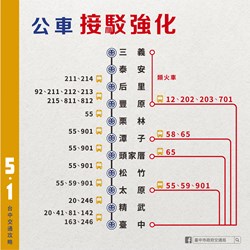 交通局表示,經分析台鐵運量資料,歸納民眾乘車習慣,建議往返山、海線地區的民眾可多加利用甲后路、中清路及台灣大道的橫向公車;山線的豐原、潭子民眾也可以搭乘55及901等公車路線至松竹站,轉乘捷運綠線往返南區、烏日;台中-新烏日之間除了直行復興路的82、101、105路公車外,也有沿台鐵路廊直行的158、242路公車、6670、6883路公路客運可提供快速直達服務,台中市內整體公車、公路客運運輸能量尚可負荷,敬請民眾安心搭乘。