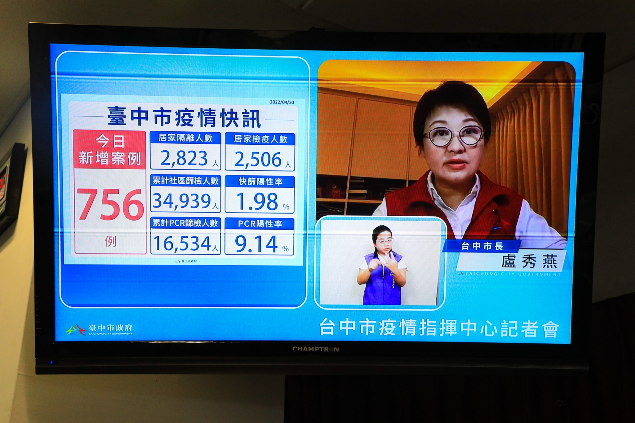 全國今(30)日本土確診新增15033例,台中市本土個案新增756例,包含校園群聚77例、職場群聚72例與家庭、朋友群聚176例。市長盧秀燕今日持續透過遠端視訊主持防疫記者會,她說,今天是她居家隔離3+4的第四天,開始自主防疫,除了427日快篩陰性外,今天再次快篩也是陰性。她也提醒,今天起是五一連假,希望大家外出口罩戴緊緊,減少到人潮多的地方,保護自己、守護家人!