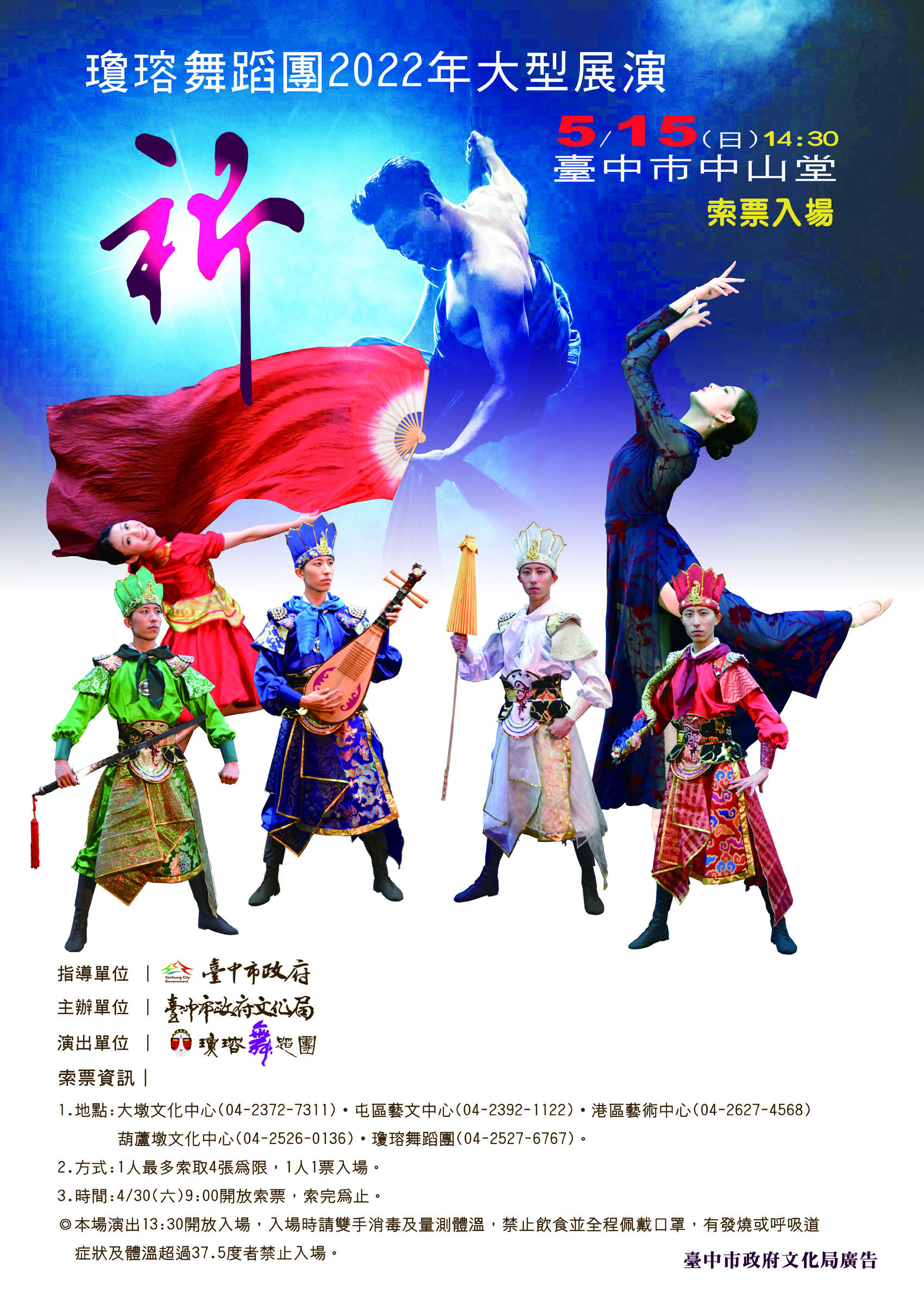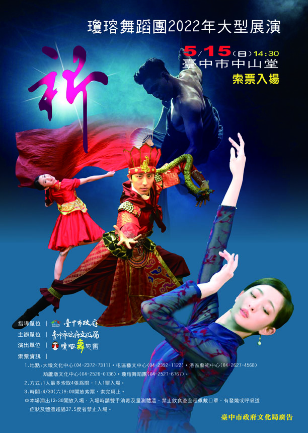 文化局說明,民眾自即日起可至大墩文化中心、屯區藝文中心、港區藝術中心、葫蘆墩文化中心服務台、瓊瑢舞蹈團免費索票,1人最多索取4張,索完為止。更多詳情資訊請上瓊瑢舞蹈團粉絲專頁(https://www.facebook.com/fycjdt/)或文化局官網(www.culture.taichung.gov.tw)查詢。