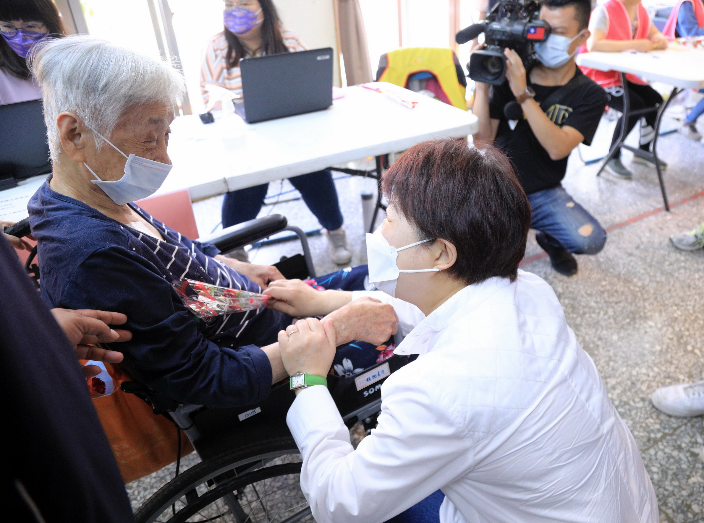 盧市長今日於現場關心民眾施打狀況及流程,現場秩序相當良好,她也特別感謝工作同仁不辭辛勞支援快打站服務,全力守護市民健康安全。明天就是母親節,盧市長特地發放康乃馨贈送文山里文化館快打站的工作同仁與民眾,預祝母親節快樂。