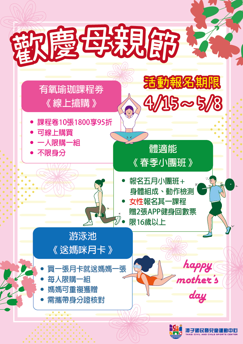 潭子國民暨兒童運動中心:凡於58日前購買月卡者,潭運將贈送1張月卡供媽媽使用,同時也開設體適能小型團體課程,提供循環肌力、戰繩燃脂、基礎重訓等豐富課程選擇;凡於活動期間報名5月課程者,將再贈身體組成及動作檢測1式,女性報名還可加贈APP健身回數票2張,續報或多人同行還可享額外優惠折扣。