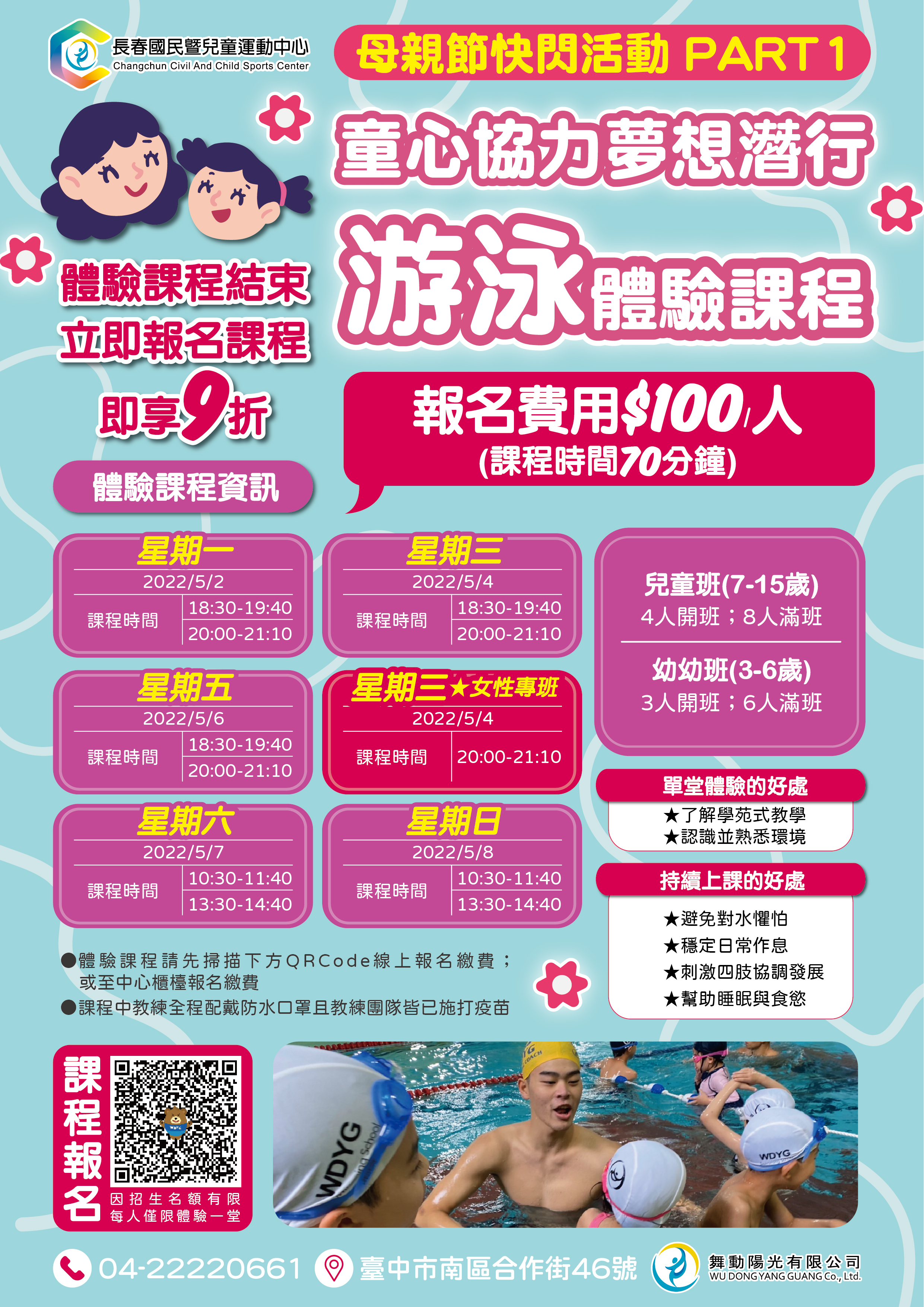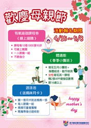 大里國民暨兒童運動中心:以「愛呀我的媽─今天免費」為主題,邀請市民朋友在母親節當日,與媽媽一同入場使用游泳池或健身房設施,即享「兩人同行,媽媽免費」優惠。