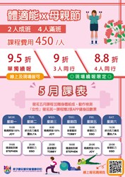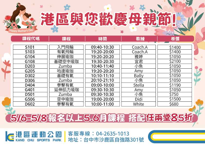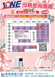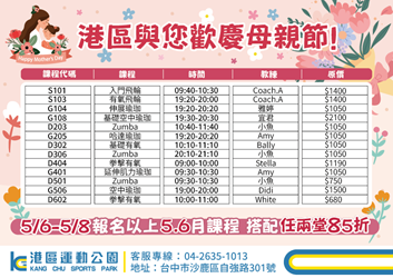港區運動公園:即日起至8日期間報名56月課程者,可享任285折優惠,課程內容包含飛輪有氧、空中瑜珈、哈達瑜珈、Zumba、拳擊有氧等;同時更與iONE體操合作母親節抽獎活動,凡於527日前參加課程者,於課後拍照打卡即贈神秘小禮物及摸彩券1張,將有機會抽中氣炸鍋、吸塵器等好禮。