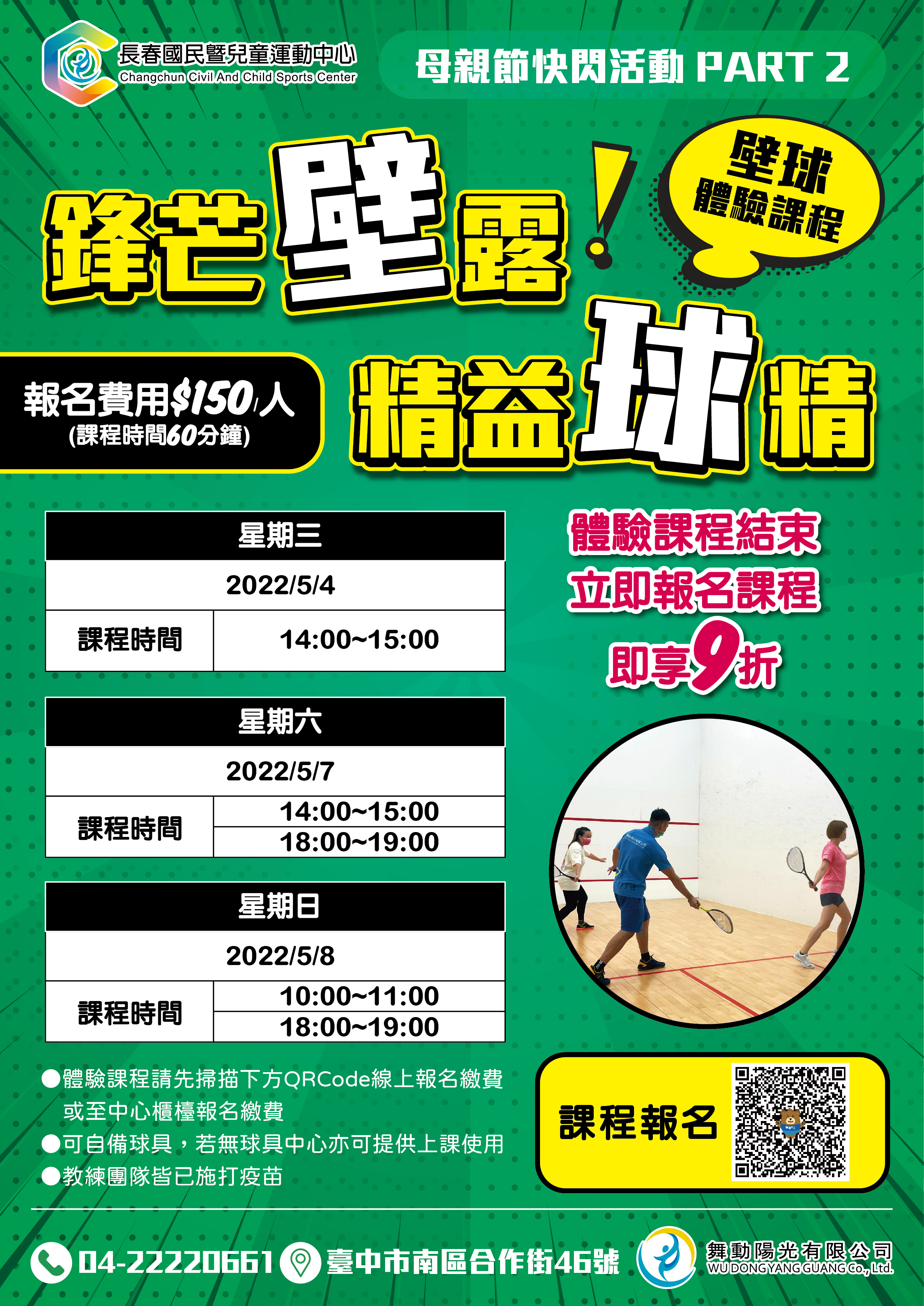 長春國民暨兒童運動中心:即日起至58日規劃母親節快閃活動,活動期間凡購買24堂私人教練課即享9折優惠價,同時,也提供游泳及壁球體驗課程的單堂體驗優惠價,完成體驗後不限時段購買課程,也可享9折優惠。