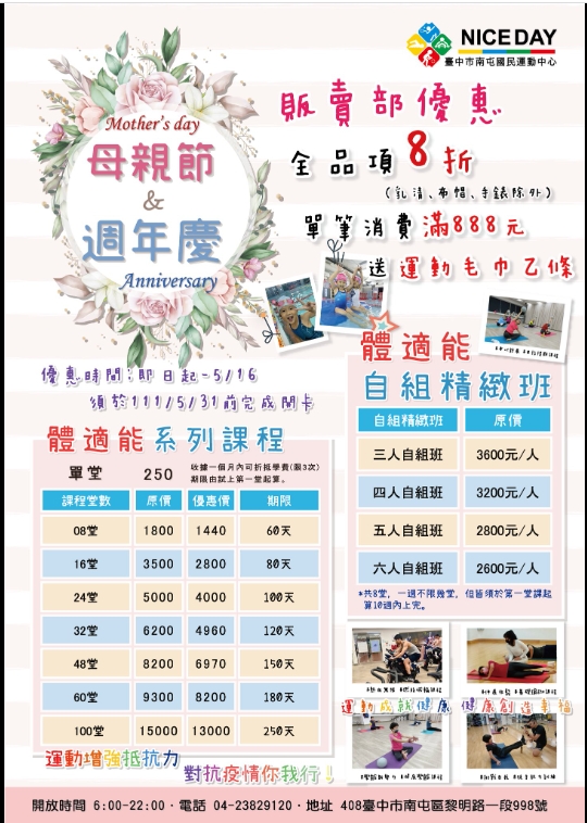 南屯國民運動中心:結合母親節及週年慶,規劃516日前運動商品販賣部全品項(其中乳清、布帽、手錶除外)均享8折優惠,滿888元還可獲贈運動毛巾,活動期間報名體適能、球類、游泳、健身系列課程、暑期營隊課程,或購買健身票卡、租用球場等還可再享專案優惠。