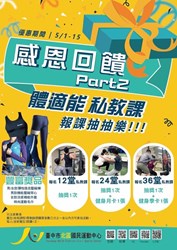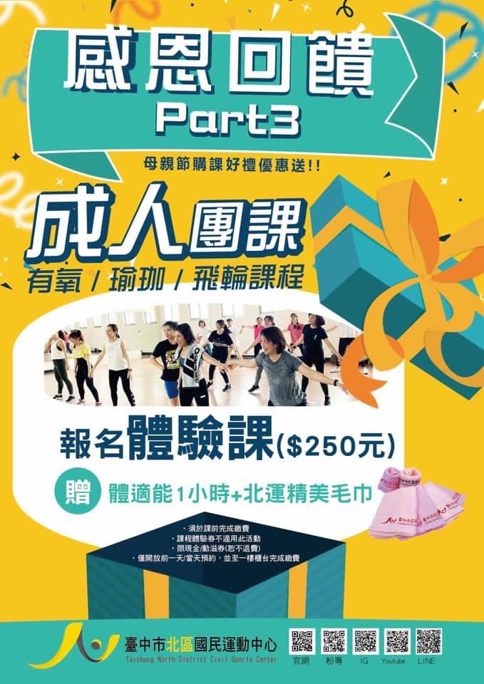 北區國民運動中心:在母親節當月,凡報名有氧、瑜珈或飛輪體驗課程,可獲贈免費使用體適能中心1小時及精美禮品;此外,515日前報名私人教練課還有機會獲贈健身月、季卡,還可抽獎拿好禮,獎品有彈性壓縮褲、機能壓縮背心、涼感機能外套、運動毛巾等。