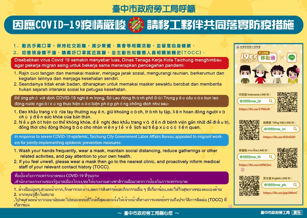 勞工局呼籲,雇主及仲介公司應持續留意最新規定並落實辦理。有關移工防疫資訊及多國語宣導資料,可至勞動部勞動力發展署跨國勞動力權益資訊維護網站查詢。如有移工防疫相關問題,可電洽勞工局專線04-22289111分機35500。(5/8*8)*勞工局