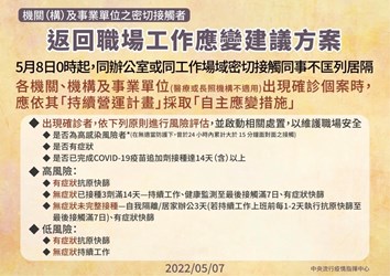 中央流行疫情指揮中心宣布自5月8日起調整密切接觸者匡列原則,將同辦公室或同工作場域九宮格同事列為自主應變對象,不再匡列居家隔離。台中市政府經濟發展局呼籲全市26萬家企業場域,仍須依「企業持續營運指引」應變,如若無戴口罩接觸確診者大於15分鐘即算高感染風險者,應視有無施打疫苗與出現症狀處置,維護職場安全。