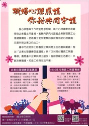 勞工局指出,家庭的困擾如果一直持續累積,而逐漸形成壓力,不僅可能影響工作的表現,更會影響心理健康,因此如何兼顧工作與家庭就顯得重要,勞工局開辦的免付費「員工無憂專線0800-666-160」,由專業人員負責接聽,並協助連結資源,以達成工作與家庭平衡。服務時間為週一至週五中午12點至晚上8點(中午不休息),以電話諮詢方式能確保隱私保密性,歡迎勞工朋友多加運用。(5/9*8)*勞工局