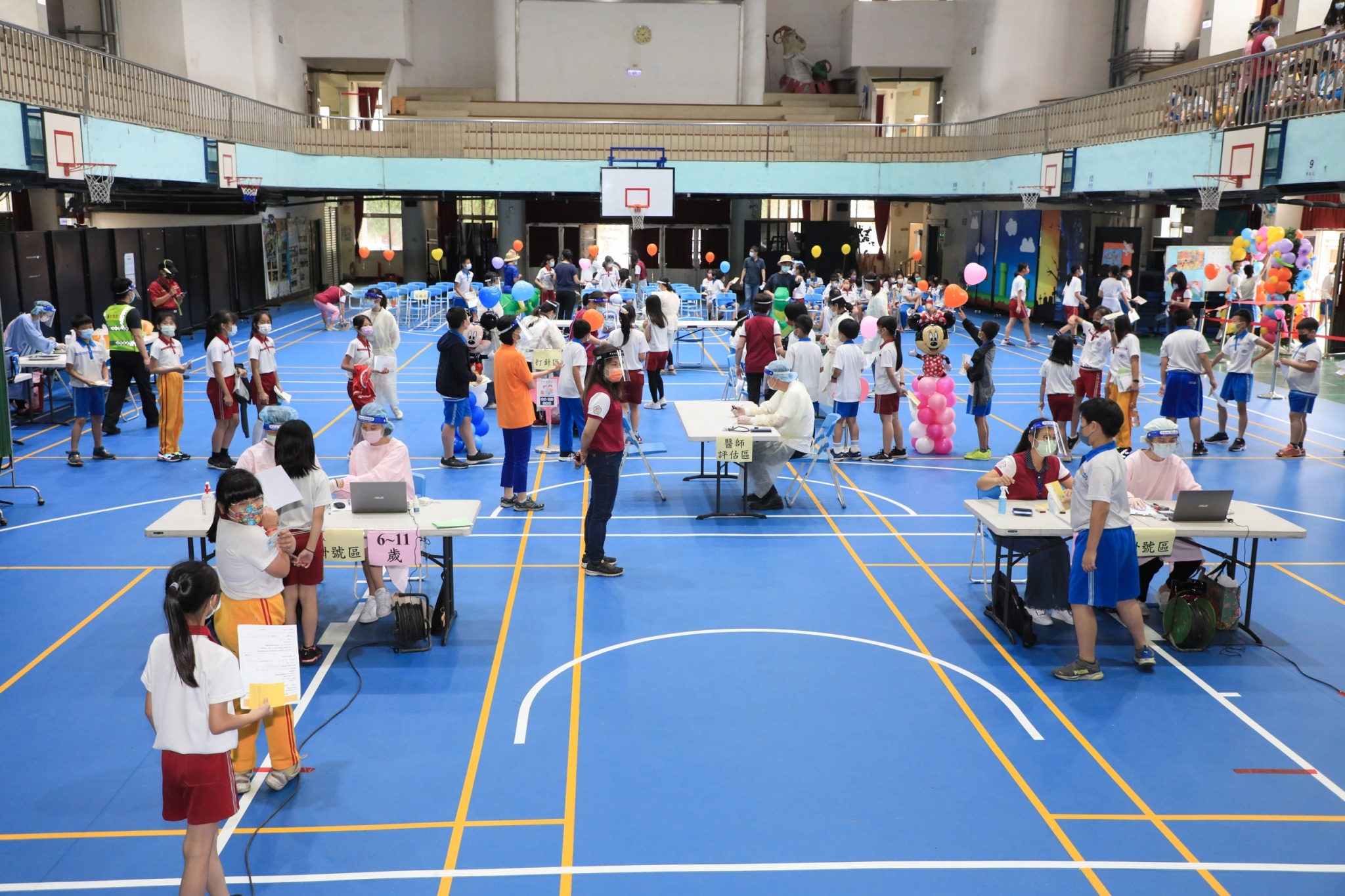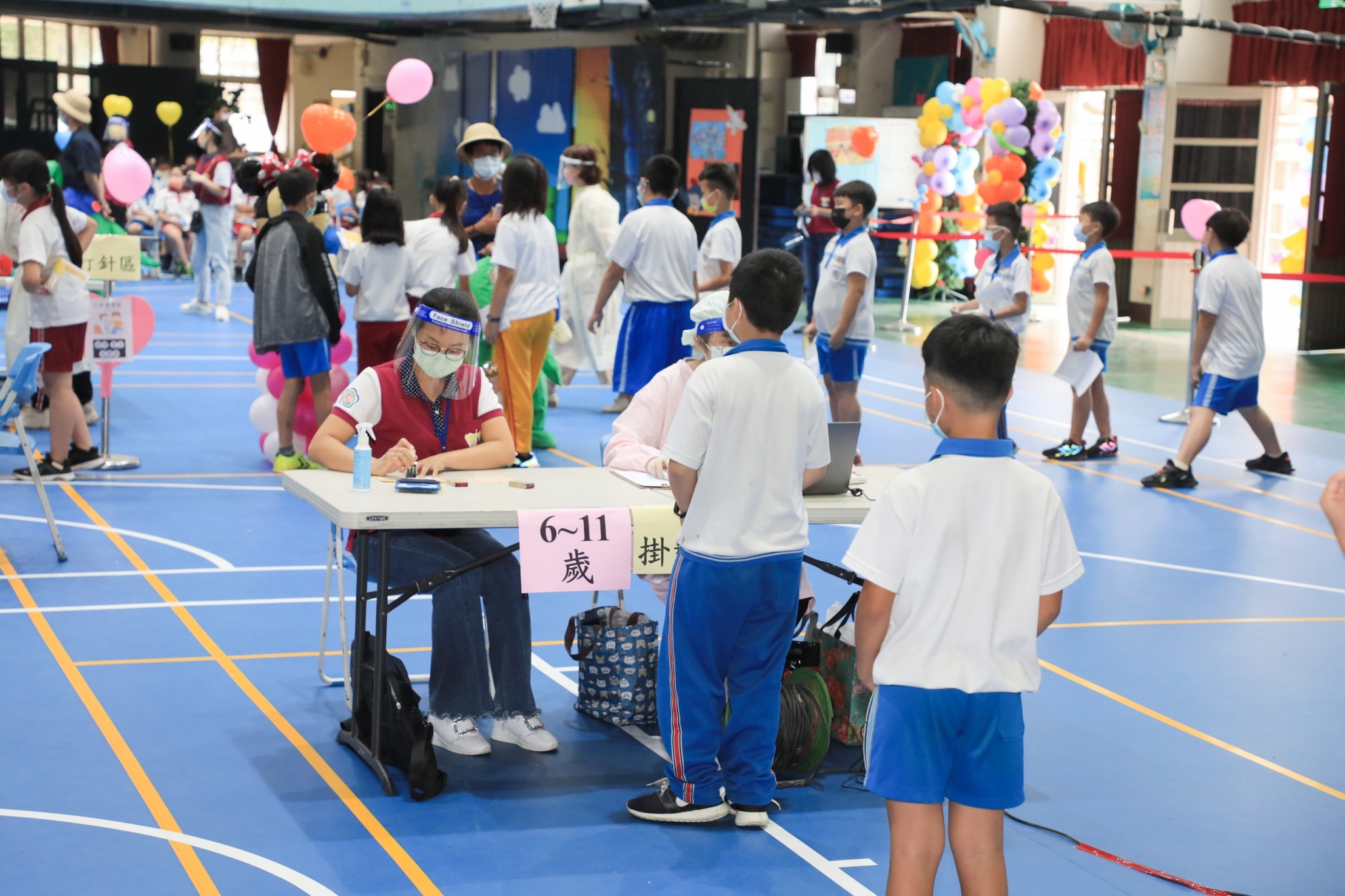 她特別感謝學校將現場布置的溫馨歡樂,有五彩繽紛的氣球,還有老師穿上騎著恐龍的卡通人物,舒緩孩童施打疫苗的緊張情緒,學校家長會也貼心為孩童提供電解質飲料。